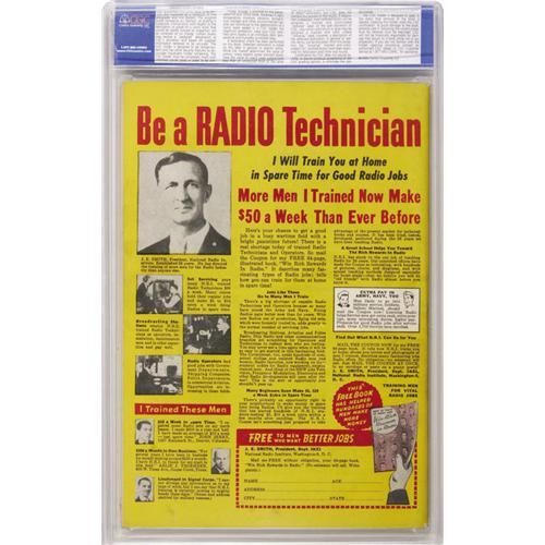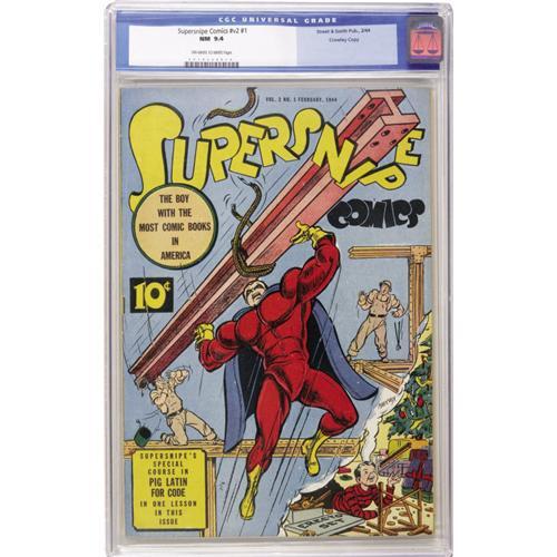 <B>Supersnipe Comics V2#1 Crowley Copy pedigree (Street & Smith, 1944) CGC NM 9.4 Off-white to white pages.</B></I> This is a Gerber "white space," i.e. one of the very few comics that Ernie Gerber couldn't find to photograph for his <B>Photo-Journal</B></I>. Thus, the man who had a knack for turning up some awfully obscure comic books was forced to tag this with a "may not exist." This is also the only issue of the series that Overstreet designates as "rare." In addition to the antics of the title character, this issue has a Huckleberry Finn story drawn by Clare Dwiggins. Overstreet 2006 NM- 9.2 value = $1,050. CGC census 10/06: 1 in 9.4, 1 higher.<BR><BR><b>Shipping:</b> Slabbed Comic (<a target="_blank" href="http://www.heritageauctions.com/common/shipping.php">view shipping information</a>)