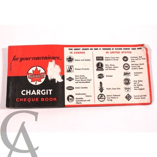Supertest Chargit Cheque Book. These books were issued as credit books for petroleum products, anti-freeze, tires, batteries, and other car related purchases. Stub receipts begin in October, 1960. Has one cheque still left in the book