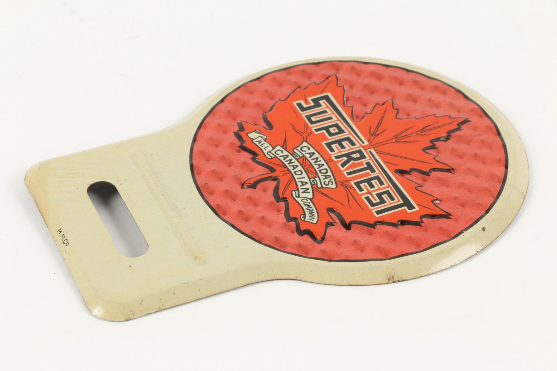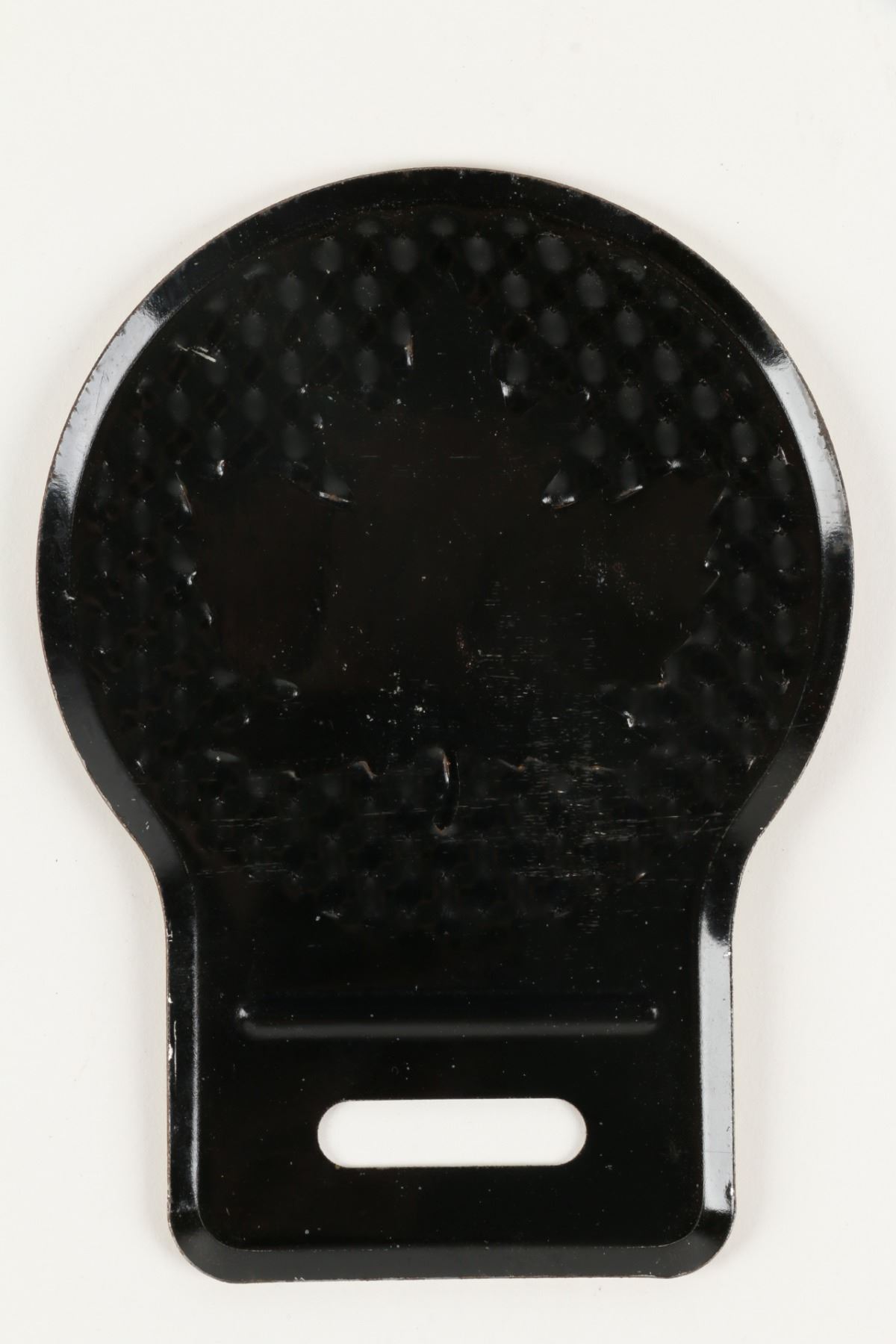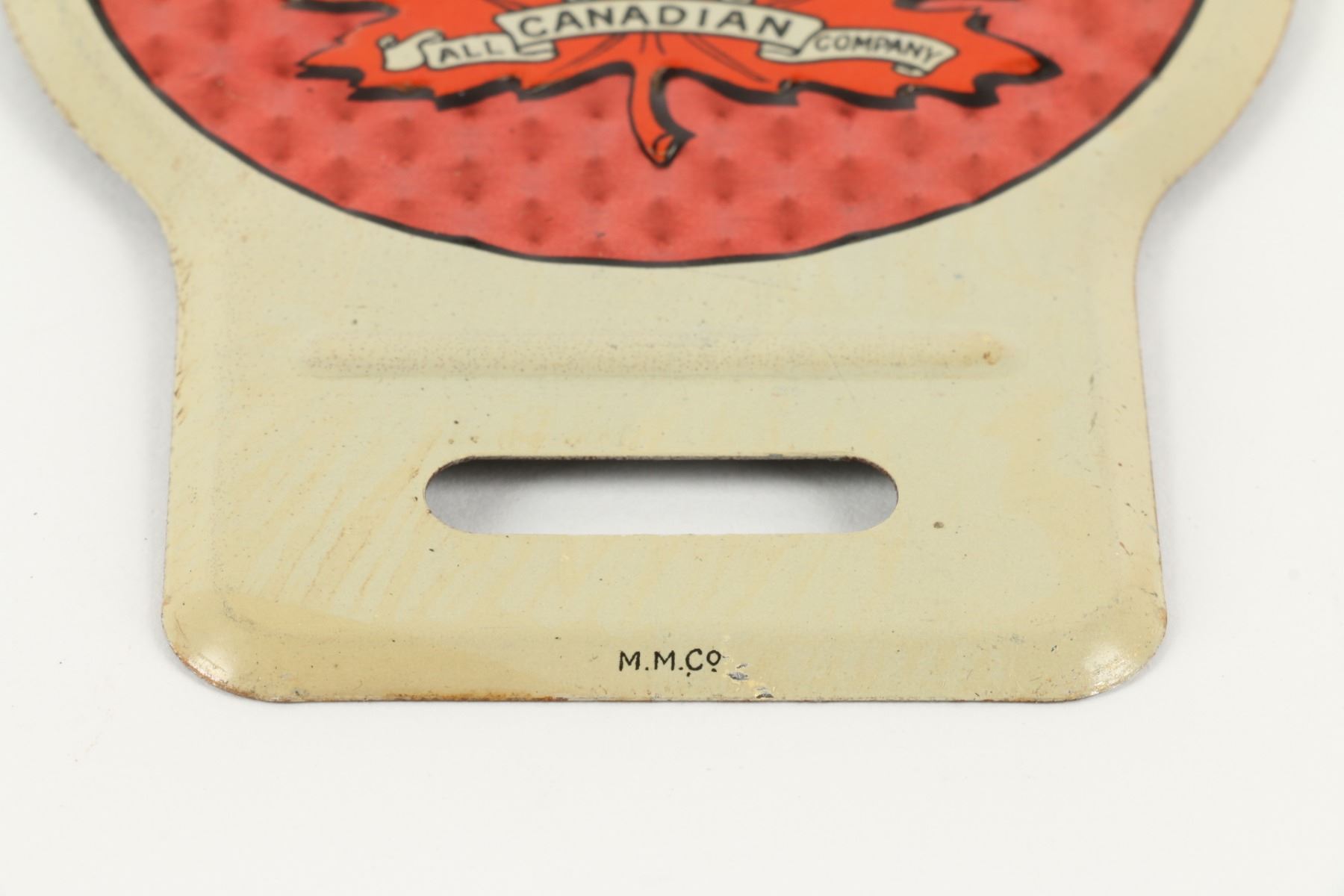 Canadian. Circa 1940. Made by Macdonald Manufacturing Co., Toronto. Embossed, lithographed tin with reflective background. Marked "M.M.Co", lower edge. 5" x 3.75". New old stock, discovered between wax paper. $200-300.
