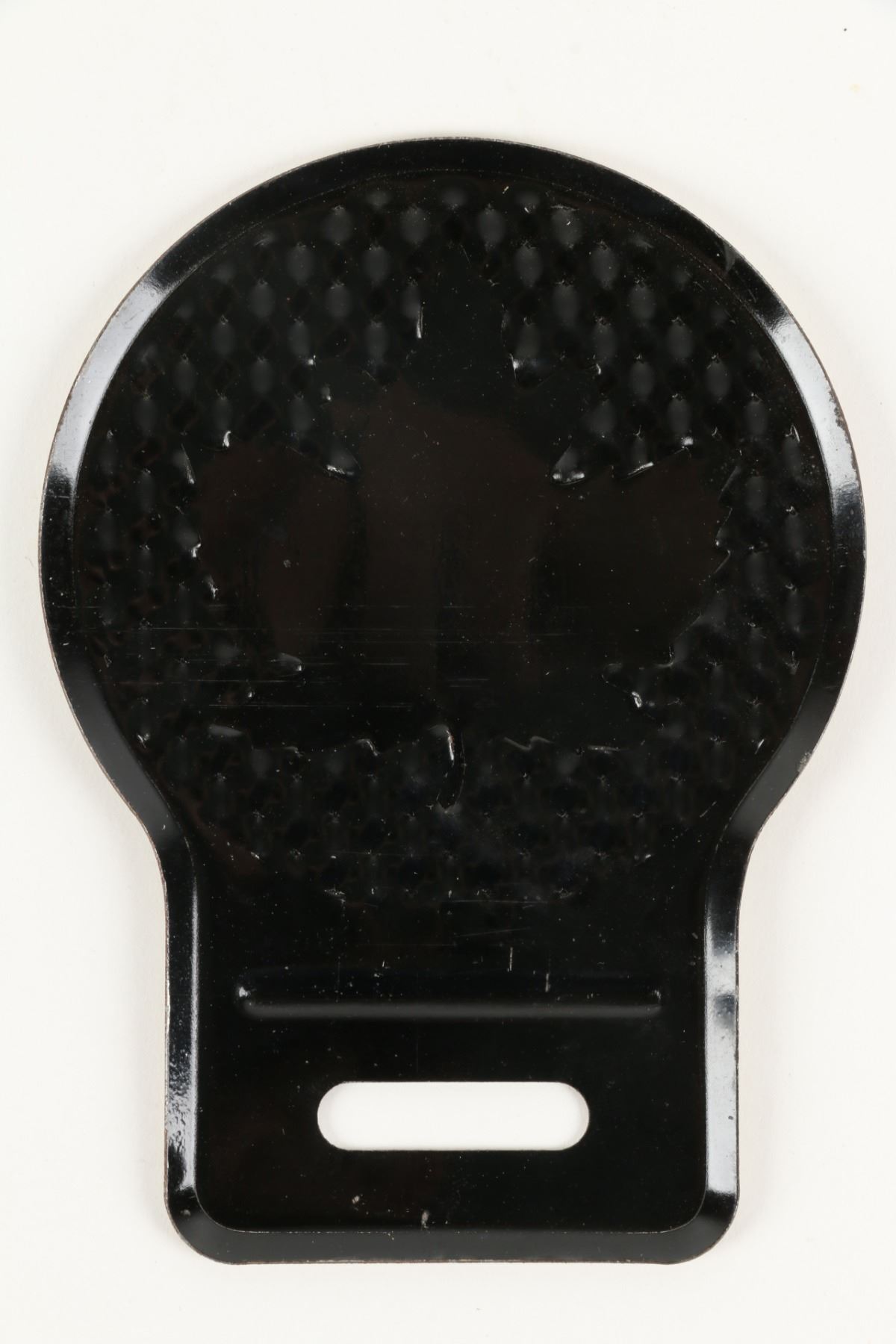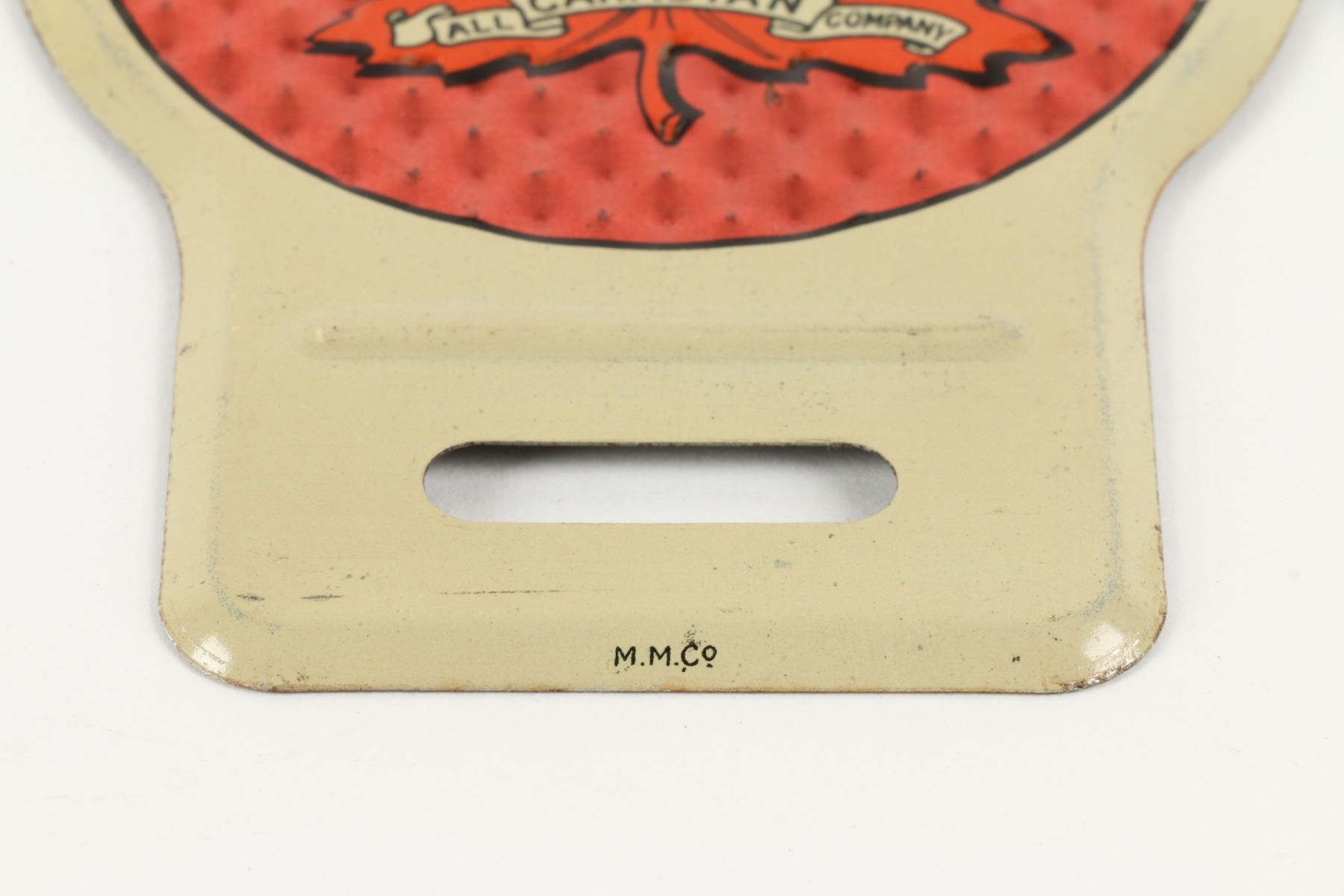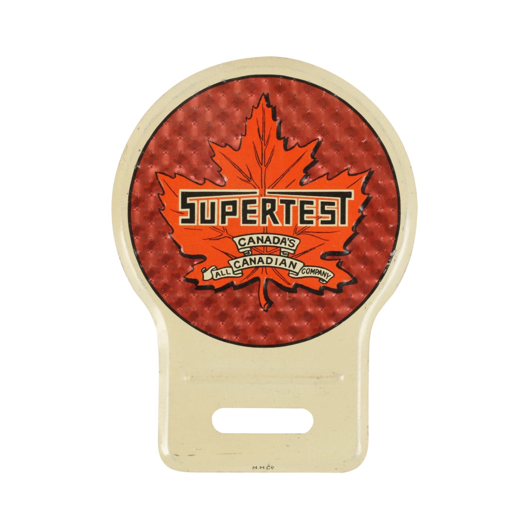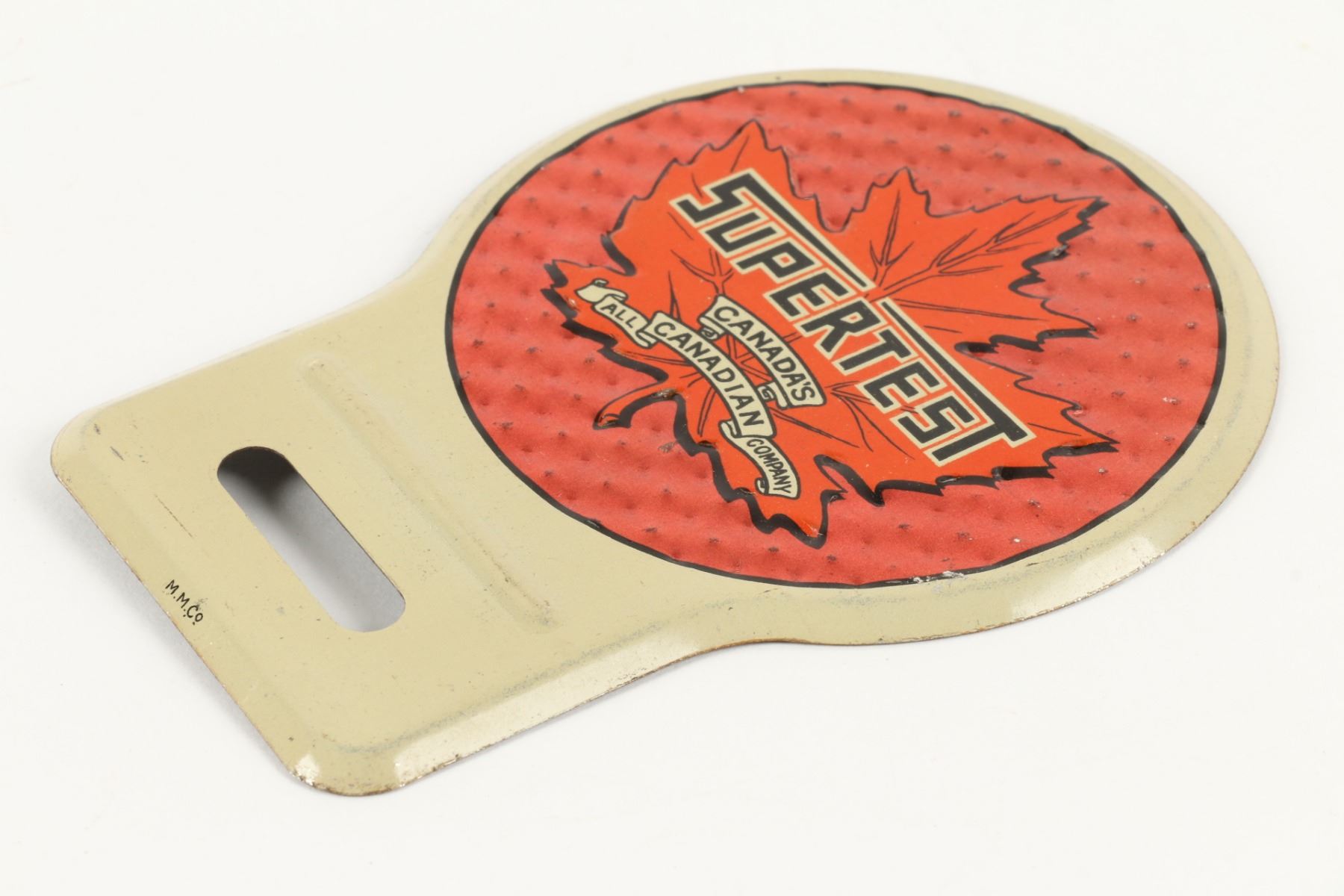 Canadian. Circa 1940. Made by Macdonald Manufacturing Co., Toronto. Embossed, lithographed tin with reflective background. Marked "M.M.Co", lower edge. 5" x 3.75". New old stock, discovered between wax paper. $200-300.