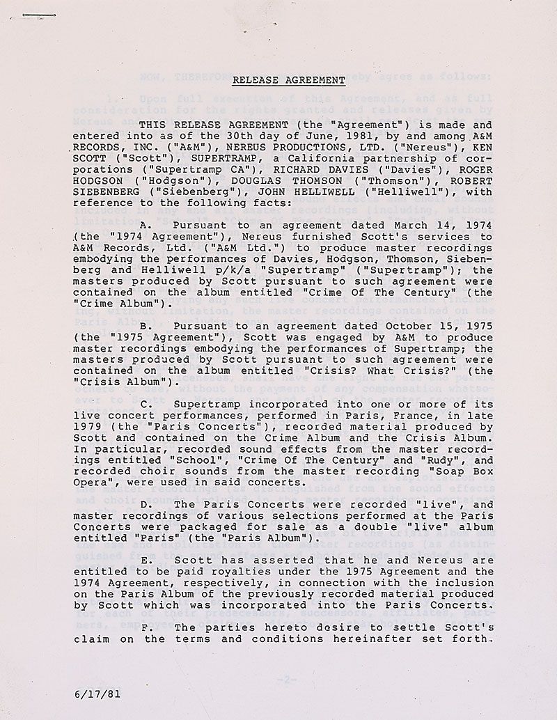 DS, four pages, 8.5 x 11, June 30, 1981. Agreement regarding a payment to record producer Ken Scott. In part: “Scott was engaged by A&M to produce master recordings embodying the performances of Supertramp; the masters produced by Scott…were contained on the album entitled ‘Crisis? What Crisis?’…Supertramp incorporated into one or more of its live concert performances, performed in Paris…recorded material produced by Scott…In particular, recorded sound effects from the master recordings entitled ‘School,’ ‘Crime of The Century,’ and ‘Rudy’…the parties hereby agree…Supertramp CA shall pay Scott the sum of…$27,500.” Signed at the conclusion by Roger Hodgson, John Helliwell, Dougie Thomson, Rick Davies (2), and Bob Siebenberg, and countersigned by Scott and two music executives. In fine condition, with expected document wear. Accompanied by a letter of authenticity from Perry Cox.