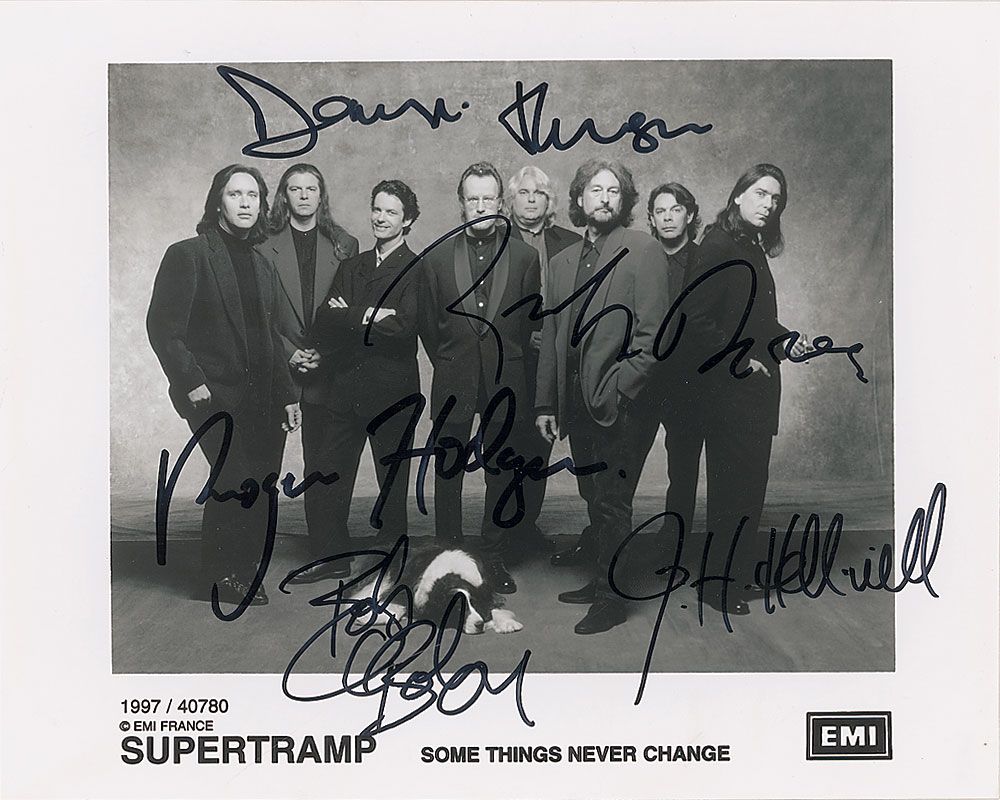 Glossy 10 x 8 EMI group promotional photo, signed in black felt tip by five members: Roger Hodgson, John Helliwell, Dougie Thomson, Rick Davies, and Bob Siebenberg. In fine condition.