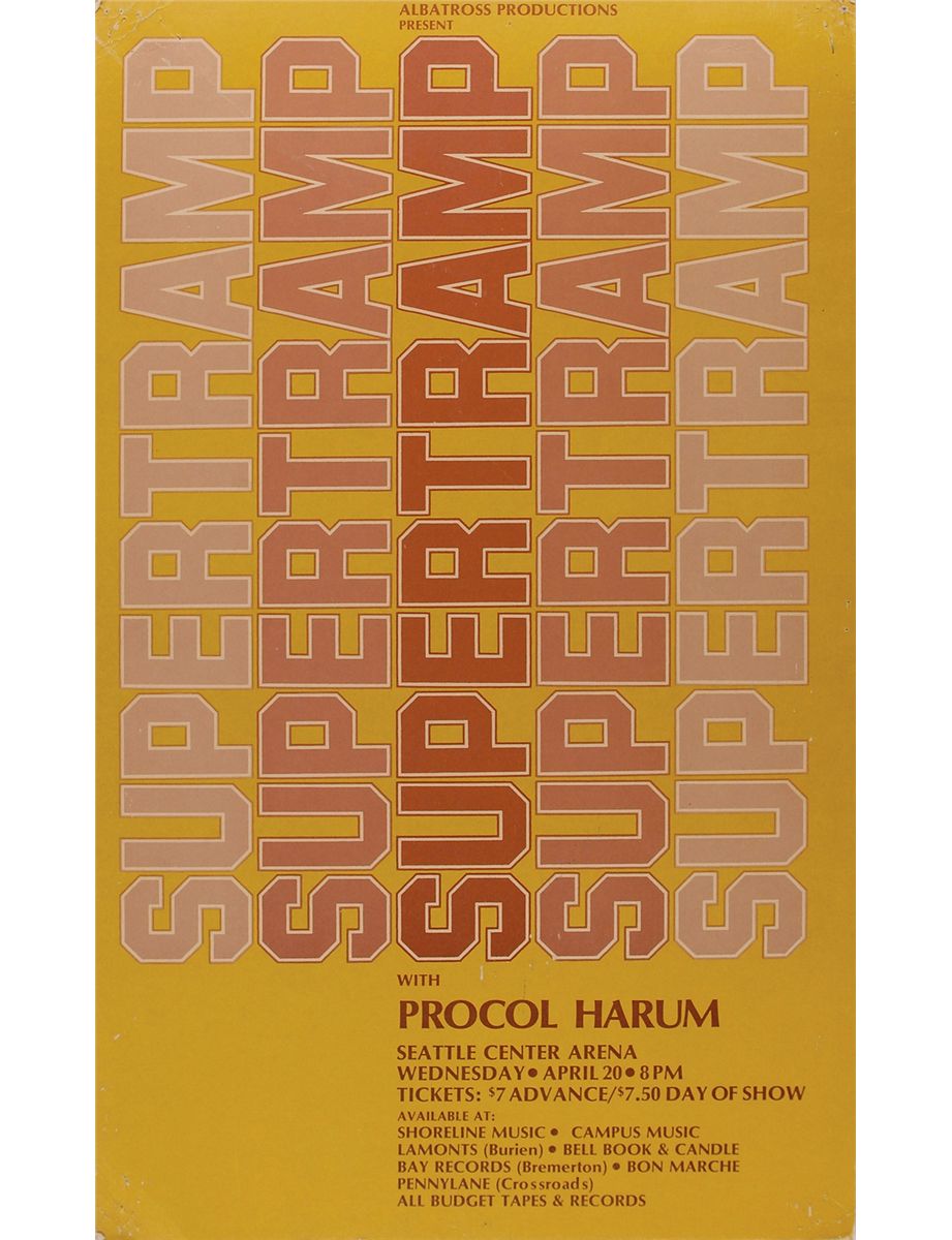 Original color 13.25 x 22 concert poster for Supertramp’s show at the Seattle Center Arena on April 20, with Procol Harum, presented by Albatross Productions. Tack holes and creasing to corners, a couple staples to edges, and a bit of light surface wear, otherwise fine condition.