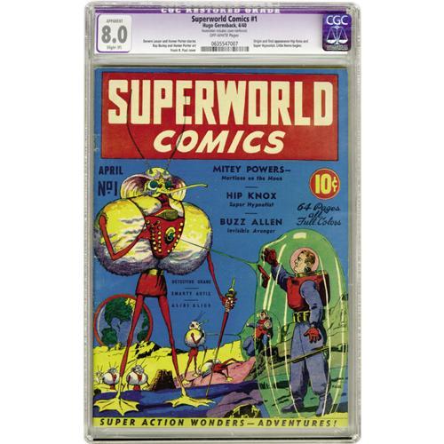 <B>Superworld Comics #1 (Hugo Gernsback, 1940) CGC Apparent VF 8.0 Slight (P) Off-white pages.</B></I> This issue is a Gerber "7" and an Overstreet "scarce". It has two names any sci-fi pulp fan will recognize -- cover artist Frank R. Paul and editor Hugo Gernsback. Inside are the origins and first appearances of Hip Knox and Super Hypnotist. Little Nemo also appears. CGC notes, "Restoration includes: cover reinforced." Overstreet 2006 GD 2.0 value = $697; VG 4.0 value =$1,394; FN 6.0 value = $2,091; VF 8.0 value = $4,879.