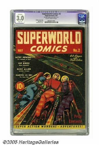 <B>Superworld Comics #2 (Hugo Gernsback, 1940) CGC Apparent GD/VG 3.0 Slight (A) Slightly brittle pages.</B></I> None of the three issues of this series turn up very often, but this one is the scarcest of all according to Ernie Gerber, who gave it his "8" rating. Overstreet uses the term "scarce," and CGC's census bears that out, as only four copies of the issue have been certified to date. The book has the first appearance of one of the all-time great comic book names, "Marvo 1-2 Go+, the Super Boy of the Year 2680." The cover is by pulp artist Frank R. Paul. CGC notes, "Restoration includes: glue on spine of cover." Overstreet 2005 GD 2.0 value = $400; VG 4.0 value = $800.