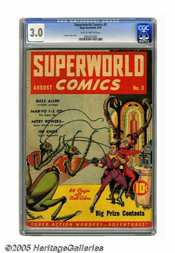 <B>Superworld Comics #3 (Hugo Gernsback, 1940) CGC GD/VG 3.0 Slightly brittle pages.</B></I> The rare insect-like "beasties" featured on this early science fiction cover are matched only by this particular comic itself. Like the two other issues from this short-lived, obscure series, this one is termed "scarce" by Overstreet. You might recognize the work of cover artist Frank R. Paul from his pulp covers (or perhaps from his famous cover for <B>Marvel Comics</B></I> #1). This still-attractive unrestored copy would make a handsome companion to issues #1 and 2; and where else but Heritage would you find all three scarce issues of this title in the same sale? Overstreet 2005 GD 2.0 value = $312; VG 4.0 value = $624. CGC census 6/05: 1 in 3.0, 4 higher.