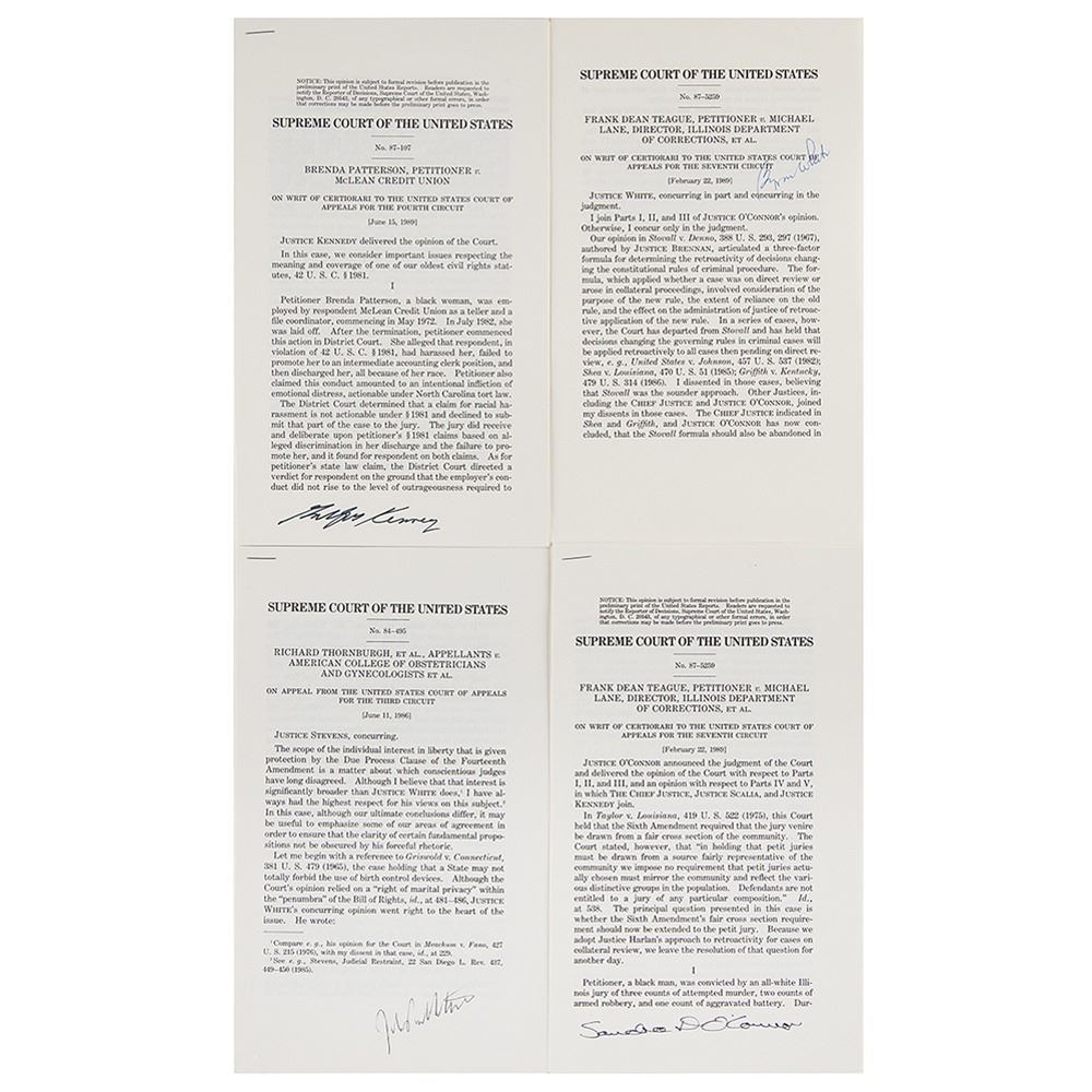 Four typescripts of Supreme Court opinions, each signed by an associated justice, including: John Paul Stevens (Thornburgh v. American College of Obstetricians), Byron White (Teague v. Lane), Sandra Day O'Connor (Teague v. Lane), and Anthony Kennedy (Patterson v. McLean Credit Union). In overall fine condition.