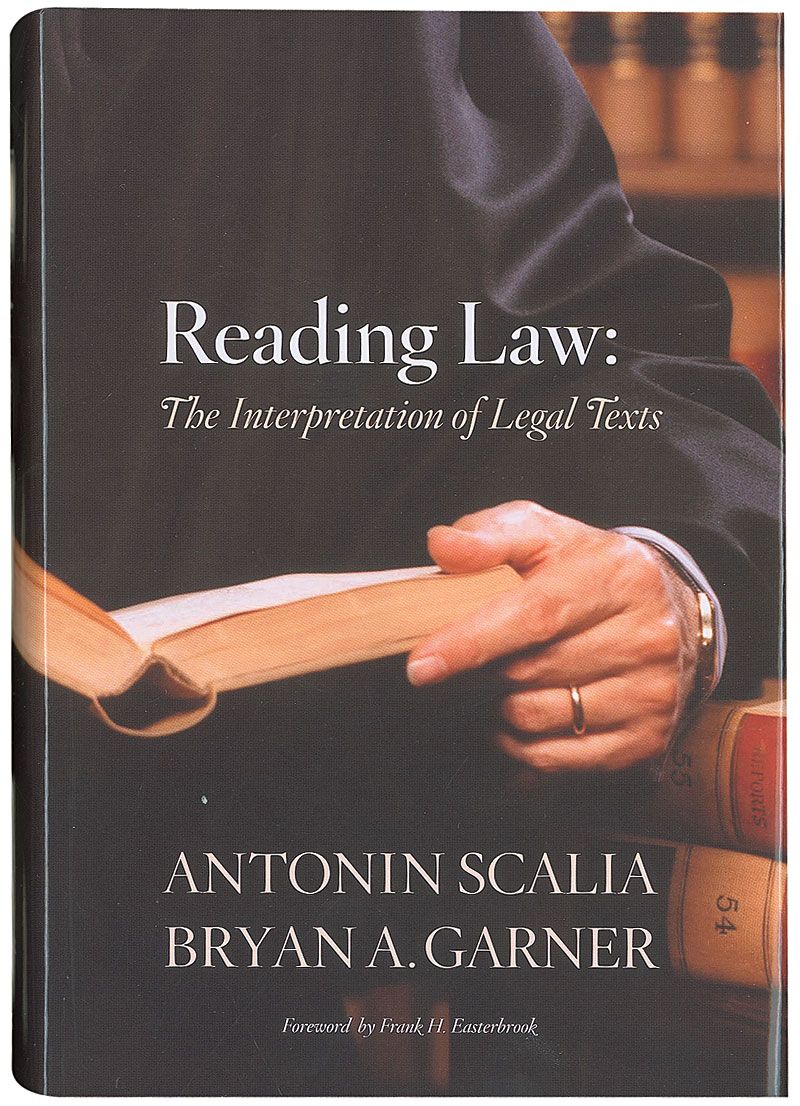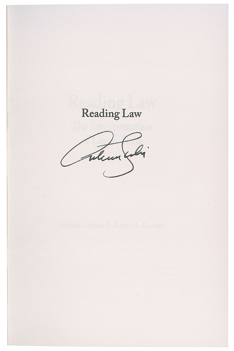 Signed book: Reading Law: The Interpretation of Legal Texts. First edition, first printing. St. Paul: Thomson/West, 2012. Hardcover with dust jacket, 6.5 x 9.25, 567 pages. Signed on the half-title page in black felt tip. In very fine condition.