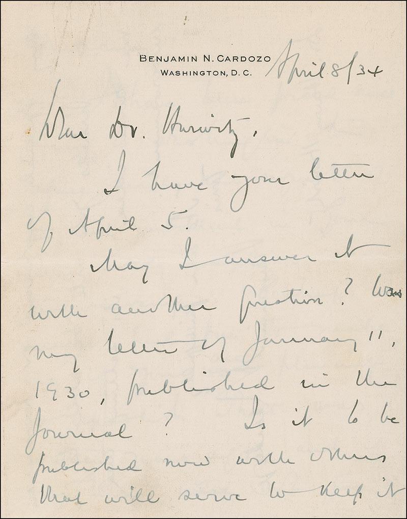 ALS, three pages on two adjoining sheets, 5 x 6.5, personal letterhead, April 8, 1934. In part: “I have been forced since coming to Washington to refuse nearly all requests of the kind embodied in your letter, and exceptions are embarrassing. Perhaps I might feel free to make one if you are planning to republish what was written years ago, and if my letter is not given special emphasis or prominence. Perhaps you will be able to give me some idea of its setting and environment.” In very good condition, with scattered wrinkles and soiling, a paperclip impression at the top of the page, and a fold touching the first letter of his signature.