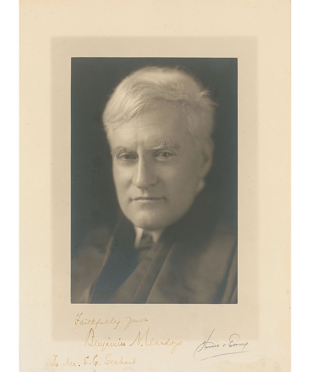 Vintage matte-finish 7 x 9.5 Harris and Ewing photo, signed and inscribed in fountain pen, “Faithfully yours, Benjamin N. Cardozo, To Mr. E. G. Gerhart.” A photographer’s pencil notation has been added near the bottom. Signature and inscription a bit light, but completely legible, and a light stain along bottom edge, otherwise fine condition.