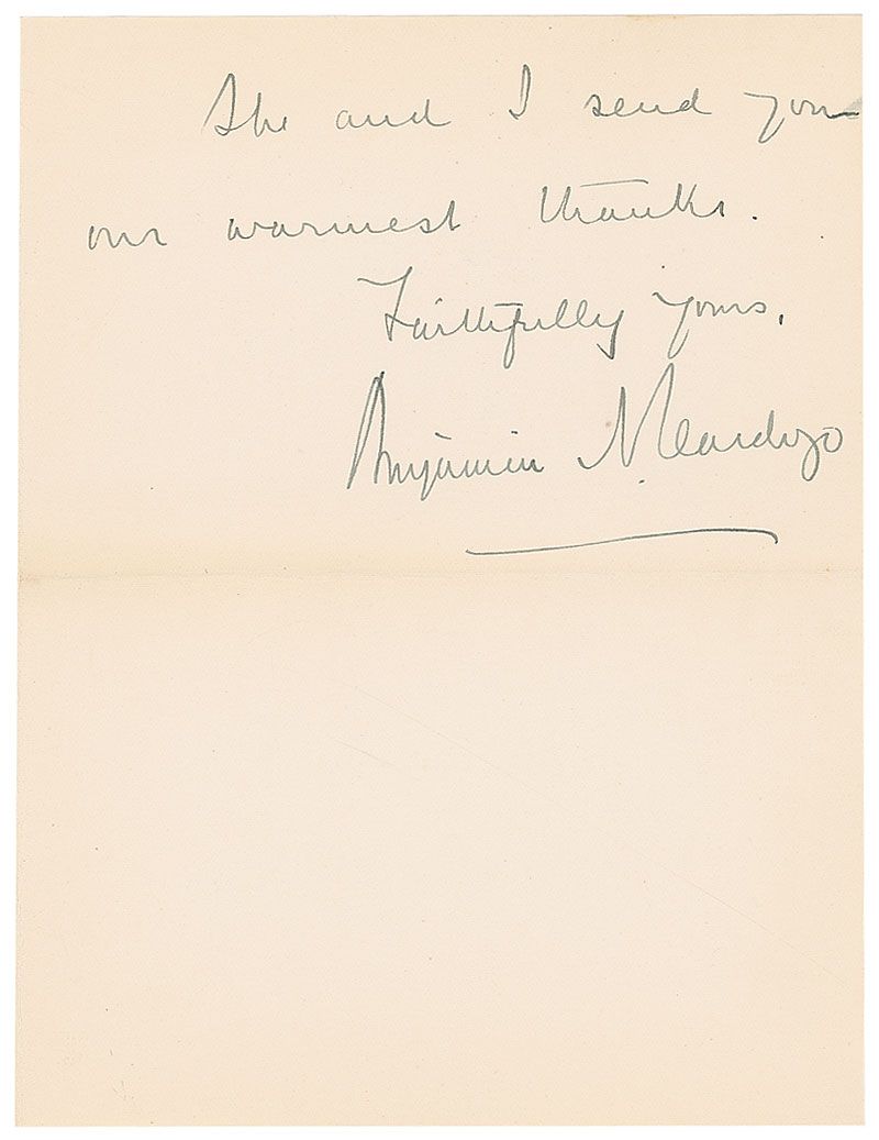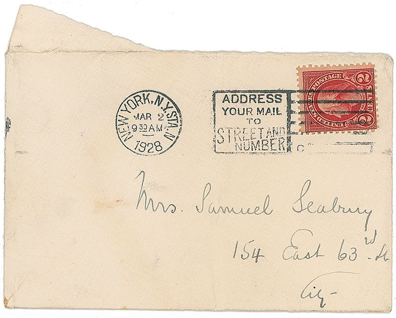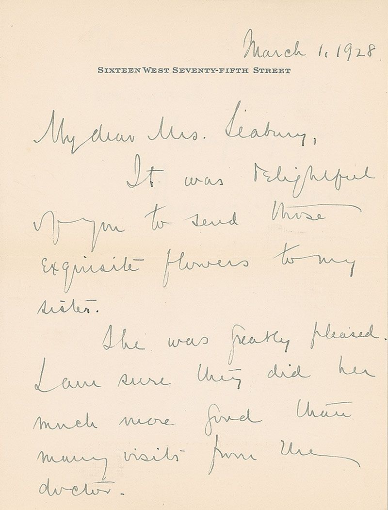ALS signed “Benjamin Cardozo,” two pages on two adjoining sheets, 4.5 x 6, personal letterhead, March 1, 1928. Letter to Mrs. Seabury. In full: “It was delightful of you to send those exquisite flowers to my sister. She was greatly pleased. I am sure they did her much more good than many visits from the doctor. She and I send you our warmest thanks.” In fine condition. Accompanied by the original mailing envelope addressed in Cardozo’s hand. Cardoza’s sister Nellie, with whom he was very close, suffered a mild stroke in February 1928. Mrs. Seabury’s husband, Samuel, served with Cardozo on the New York State Court of Appeals, where Cardozo was Chief Judge from 1926-1932.