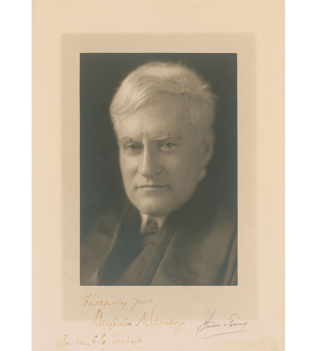 Matte-finish 7 x 9.5 Harris and Ewing photo, signed and inscribed in the lower border in fountain pen, “Faithfully yours, Benjamin N. Cardozo, To Mr. E. G. Gerhart.” A photographer’s pencil notation has been added near the bottom. Signature and inscription a bit light, but completely legible, and a light stain along bottom edge, otherwise fine condition.