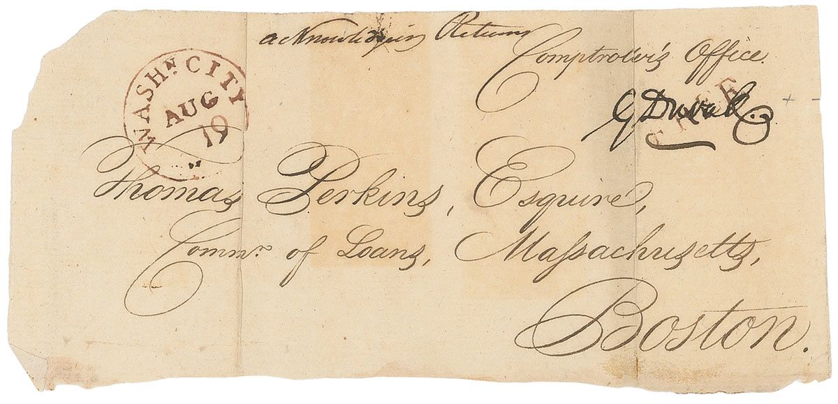 Associate Justice of the Supreme Court of the United States from 1811 to 1835. Free franked address panel, 7 x 3, addressed in an unknown hand to “Thomas Perkins, Esquire, Comm. Of Loans, Boston, Massachusetts,” and franked in the upper right, “G. Duvall,” signing on top of a “Free” stamp. In very good condition, with two vertical folds, and scattered blocks of light toning.