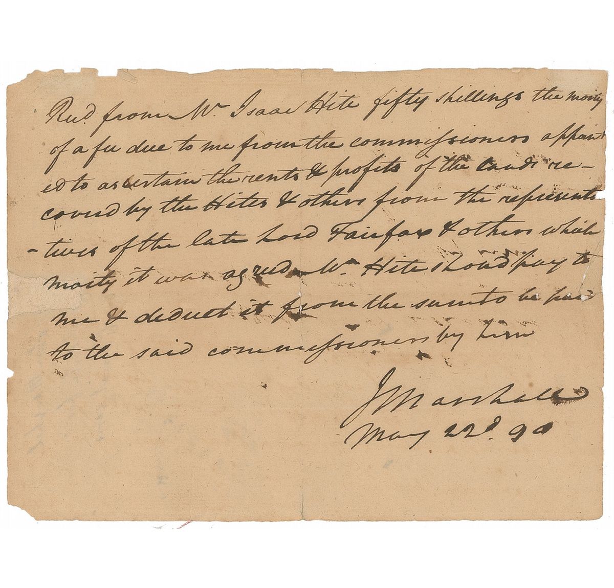 Influential American statesman and jurist (1755–1835) who served as the fourth Chief Justice of the Supreme Court. Among the notable cases over which Marshall presided were the judicial review landmark Marbury v. Madison (1803) and the 1807 trial of Aaron Burr for treason. ADS, signed “J. Marshall,” one page, 7.25 x 5.5, May 22, 1790. Financial document reads, in full: “Recd from Mr. Isaac Hite fifty shillings the moity of a fee due to me from the commissioners appointed to ascertain the rents & profits of the lands recovered by the Hites & others from the representatives of the late Lord Fairfax & others which moity it was agreed Mr. Hite should pay to me & deduct it from the sum to be paid to the said commissioners by him.” A few small separations and repairs to intersecting folds, repair to a small area of paper loss and two missing words near left edge, chips to edges, scattered light toning and soiling, and a few brushes to text and end of signature, otherwise very good condition.