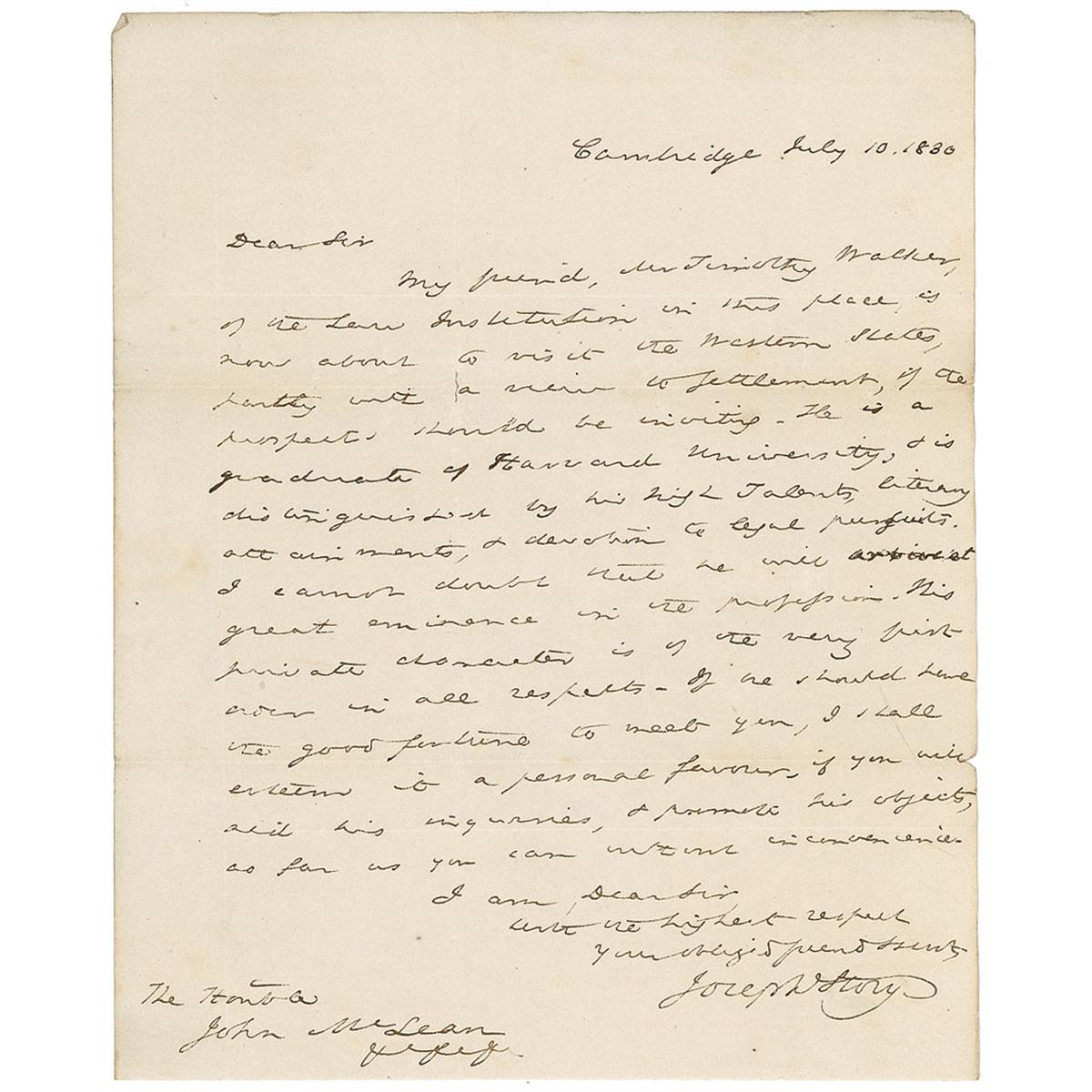Associate Justice of the Supreme Court who favored expanding federal power. He wrote many legal treatises, including Commentaries on the Constitution of the United States, The Conflict of Laws, and Law of Partnership. ALS, one page, 8 x 9.75, July 10, 1830. Letter to newly appointed Associate Justice John McLean. In full: “My friend, Mr. Timothy Walker of the Law Institution in this place is now about to visit the Western states, partly with a view to settlement, if the prospect should be inviting. He is a graduate of Harvard University and is distinguished by his high talents, literary attainments and devotion to legal pursuits. I cannot doubt that he will achieve great eminence in the profession. His private character is of the very first order in all respects. If he should have the good fortune to meet you, I shall esteem it a personal favour if you will aid his inquiries & promote his objects as far as you can without inconvenience.” Second integral page bears an address panel in another hand In fine condition, with intersecting folds, one through a single letter of signature, and some mild soiling.