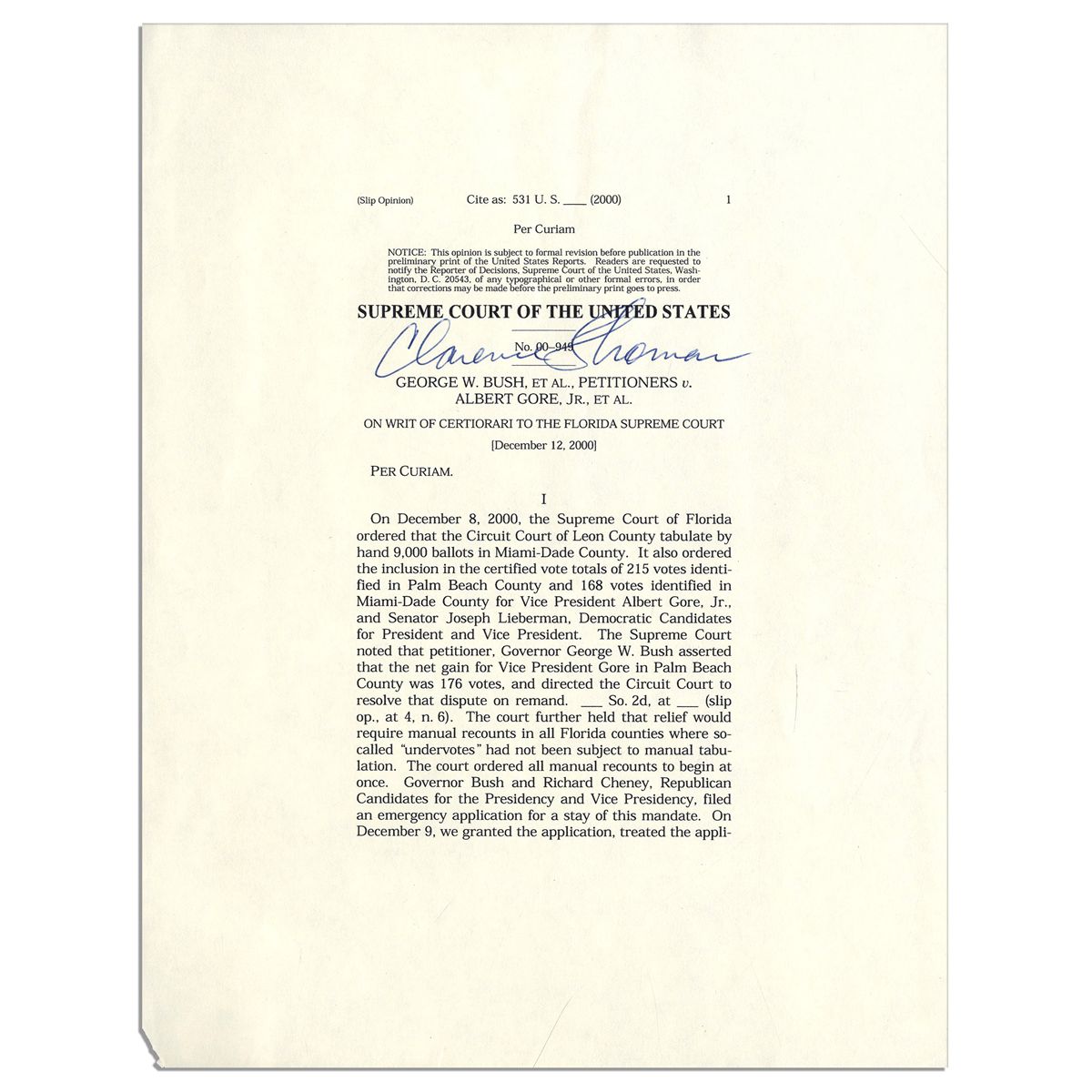 Thirteen page copy of the U.S. Supreme Court decision on the historic 2000 presidential election signed boldly by Justice Clarence Thomas on title page. Measures 8.5'' x 11''. Fine condition.