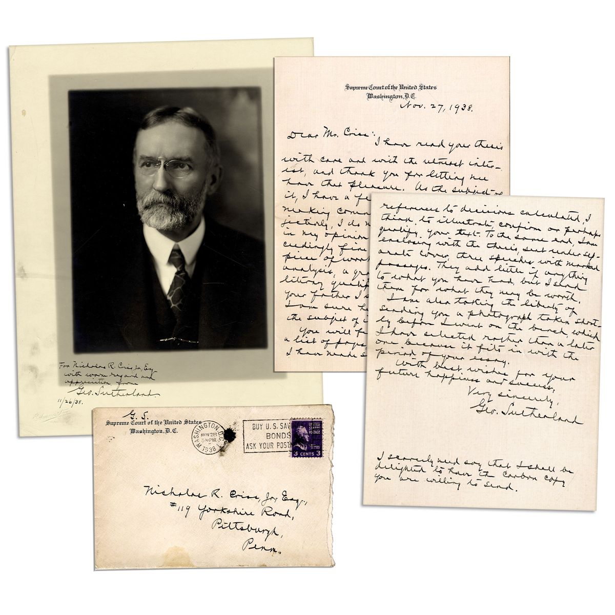 George Sutherland autograph letter signed and photo signed the year he retired as a Justice from the U.S. Supreme Court. Letter, dated 27 November 1938 on Supreme Court stationery reads in part: ''Dear Mr. Criss: I have read your thesis...As the subject of it, I have a feeling of constraint about making comments, but, speaking objectively, I do not hesitate to say that in my opinion you have done an exceedingly fine and discriminating piece of work...if I were your father I should be very proud, as I am sure he is...I am also taking the liberty of sending you a photograph taken shortly before I went on the bench...Geo. Sutherland...'' 2pp. letter on separate sheets of card-style stationery, measures 5.75'' x 7.75''. Near fine. Sutherland inscribes the lower left of the photo, ''For Nicholas R. Criss Jr., Esq / with warm regard and / appreciation, from / Geo. Sutherland / 11/26/38.'' Bust portrait photo measures 11'' x 14''. Toning and smudging to left border and mounted to paper board, else near fine.