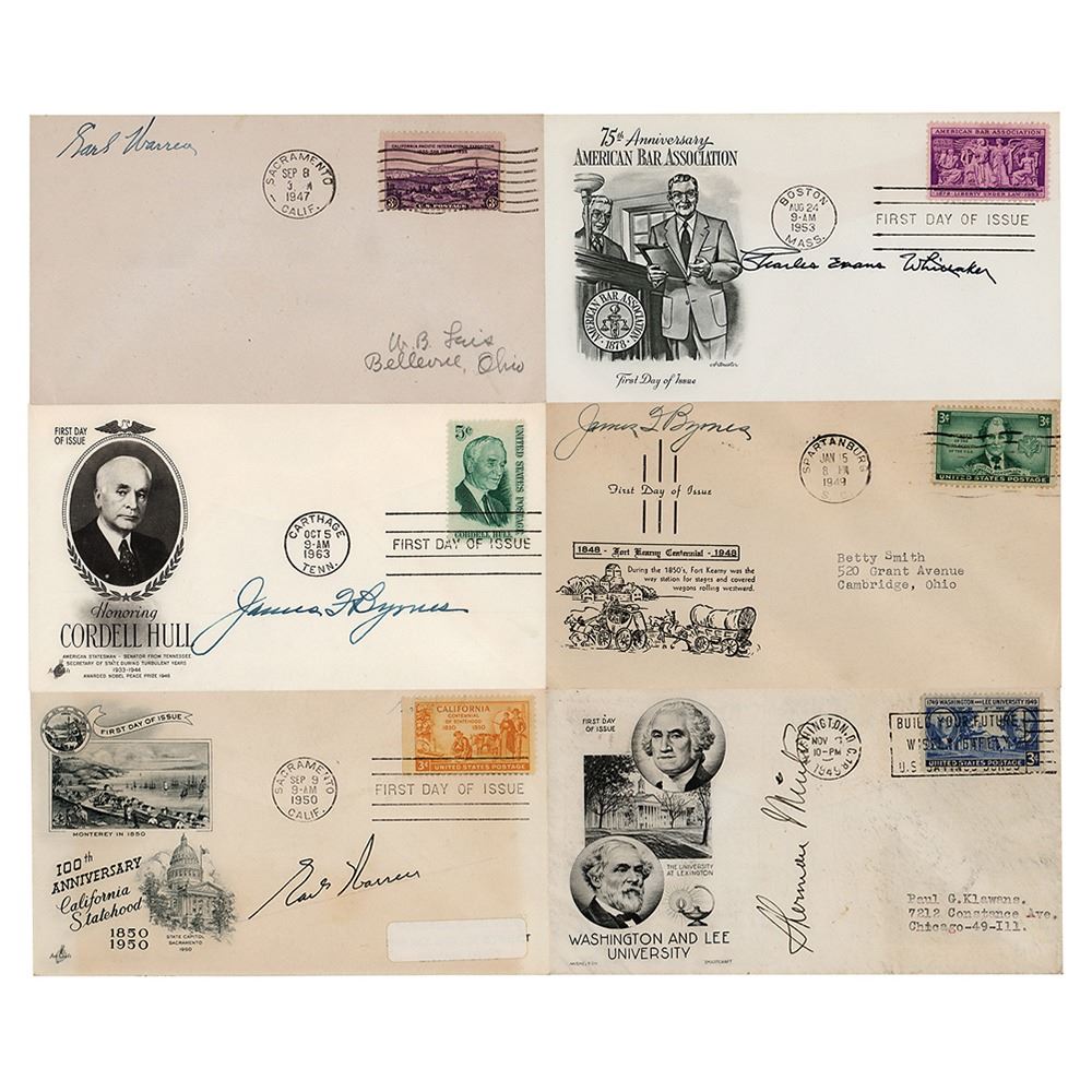 Six commemorative covers signed in ink by justices of the United States Supreme Court, including: Earl Warren (2), Sherman Minton, James F. Byrnes (2), and Charles Evans Whittaker. In overall fine condition, with minor toning and soiling.