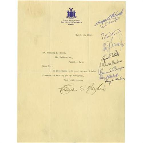 <B>Supreme Court: Letter Signed by 10 Justices.</B></I> Typed Letter Signed "<I>Charles E. Hughes</B></I>," one page, 8" x 10.5". Albany, March 11, 1908. New York Governor Hughes sends his autograph to Manning P. Brown of Passaic, New Jersey. <B>Charles Evans Hughes</B></I> later served as Associate Justice (1910-1916) and Chief Justice (1930-1941) of the Supreme Court. A collector had the following nine Justices add their signatures to this letter in the upper right margin: <B>Hugo L. Black</B></I> (Associate Justice, 1937-1971), <B>W.O. Douglas</B></I> (1939-1975), <B>Potter Stewart</B></I> (1958-1981), <B>Wm. J. Brennan</B></I> (1956-1990), <B>Byron R. White</B></I> (1962-1993), <B>John M. Harlan</B></I> (1955-1971), <B>Warren E. Burger</B></I> (Chief Justice, 1969-1986), <B>Thurgood Marshall</B></I> (1967-1991), and <B>Harry A. Blackmun</B></I> (1970-1994). Light mounting stains on verso. Fine condition.<BR><BR><b>Shipping:</b> Flat Material, Small (<a target="_blank" href="http://www.heritageauctions.com/common/shipping.php">view shipping information</a>)