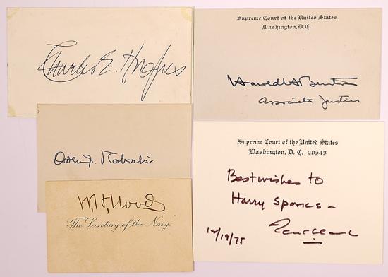Supreme Court Justices - Early 20th Century. Cards signed by five justices whose service was either wholly in the first half of the 20th century or began then. Chief Justice "Charles E. Hughes" signed a plain card, which is affixed to a piece of paper; he lived 1862-1948 and served 1930-41. Two are on Supreme Court cards: "Harold A. Burton / Associate Justice" (lived 1888-1964; served 1945-58); and "Best wishes to Harry Sparks. Tom Clark 12/19/75"; Clark lived 1899-1975 and served 1949-67). "Owen J. Roberts" signed on the back of a cut-down index card; he lived 1875-1955 and served 1930-45. "M.J. Moody" signed on a card engraved "The Secretary of the Navy," which he was 1902-04; he lived 1853-1917 and served on the court 1906-10. Overall about fine.