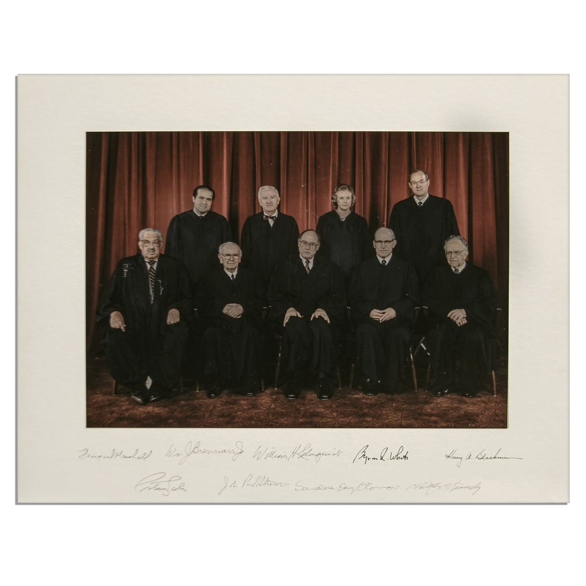 Supreme Court Justices photo and signed mat. The nine Justices from the 1988-1990 Rehnqiust court are all pictured in the photo. Mat is hand-signed by Byron White, Harry Blackmun, John Paul Stevens, Sandra Day O'Connor, Anthony Kennedy, Thurgood Marshall and William Brennan. Rehnquist and Scalia's names are signed by autopen. Photograph measures 13.5'' x 11'', matted to 20'' x 16''. Pencil notation to verso, else near fine.