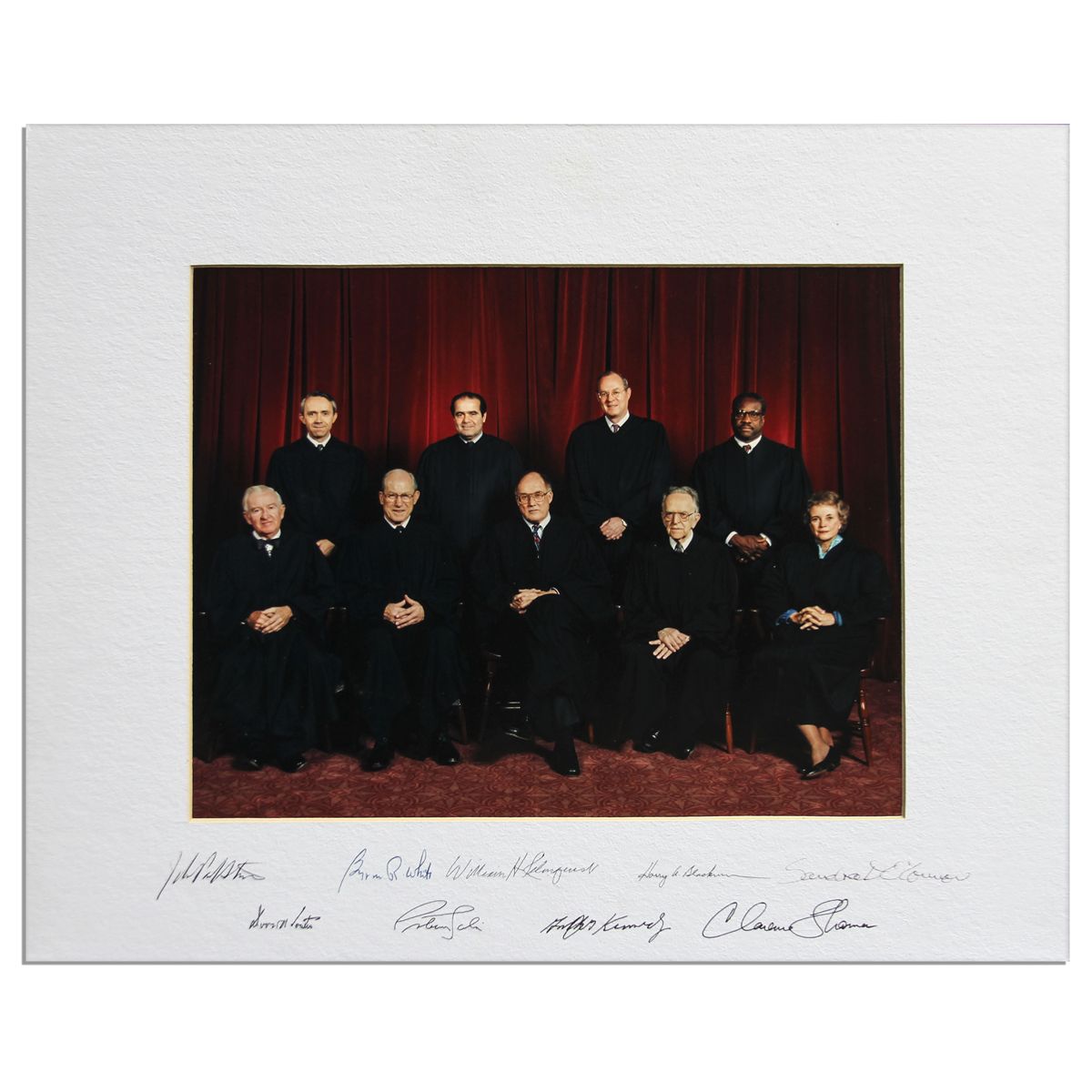 Supreme Court Justices photo and signed mat. The nine Justices from the 1991-1993 Rehnquist court are all pictured in the photo. Mat is signed by Harry A. Blackmun, John Paul Stevens, Sandra D. O'Connor, Anthony M. Kennedy, David H. Souter, Clarence Thomas and Byron R. White. Rehnquist and Scalia are signed with autopen. Photograph measures 13.5'' x 9.5'' and mat measures 18'' x 14''. Near fine.