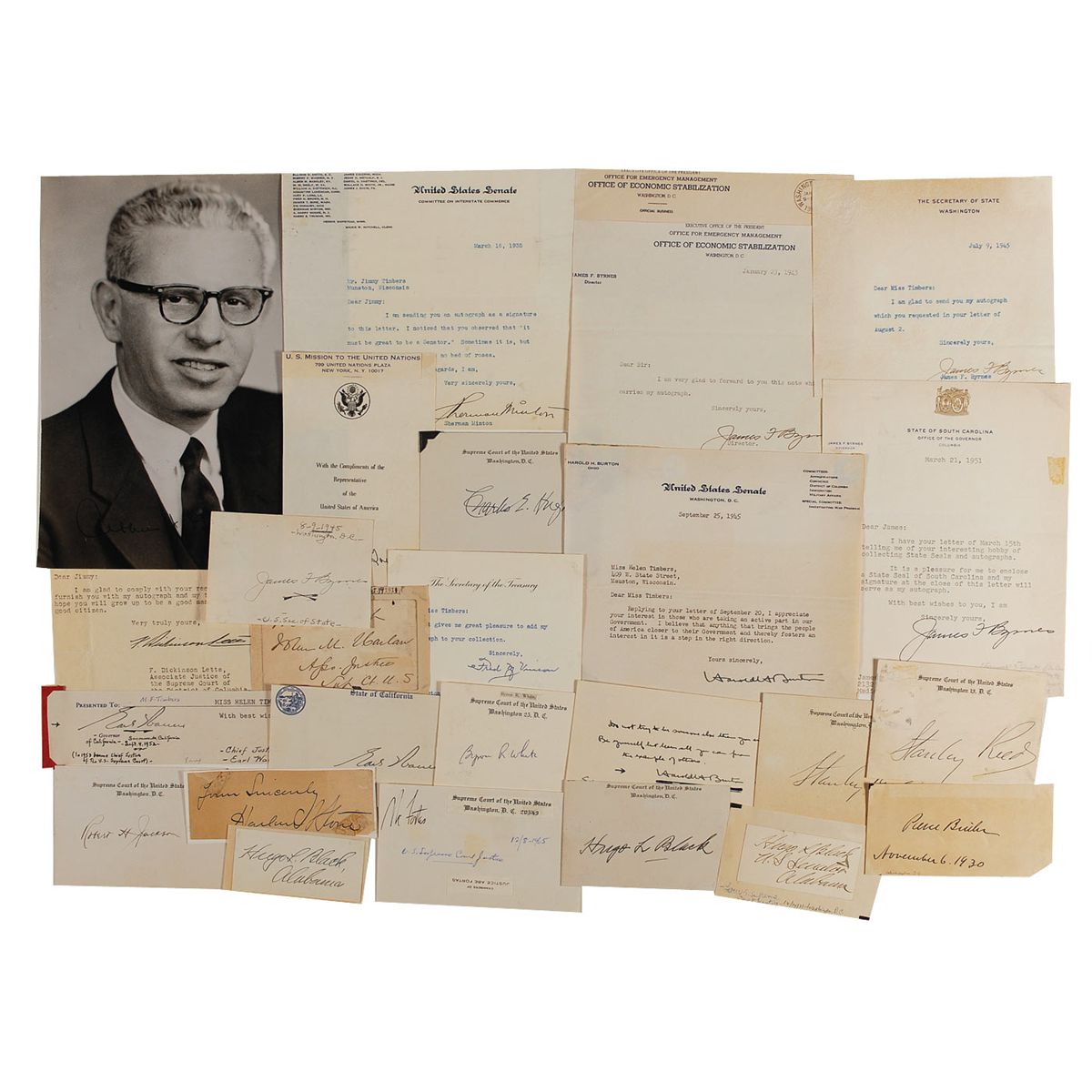 Twenty-five items consisting of vintage signatures on various size cards and slips, letters, and a photo, each signed by a former Justice. Signers are: Charles Evans Hughes, Pierce Butler, Earl Warren (2), John Marshall Harlan, Hugo Black (3), Fred Vinson, Sherman Minton, Arthur Goldberg (2), Abe Fortas, Robert Jackson, Harlan Stone, Stanley Reed (2), Harold Burton (2), Byron White, and James Byrnes (4). Also included is a signature of federal judge F. Dickinson Letts. In very good condition, with various scattered toning, trimmed edges, folds, and mounting remnants to some of the corners.