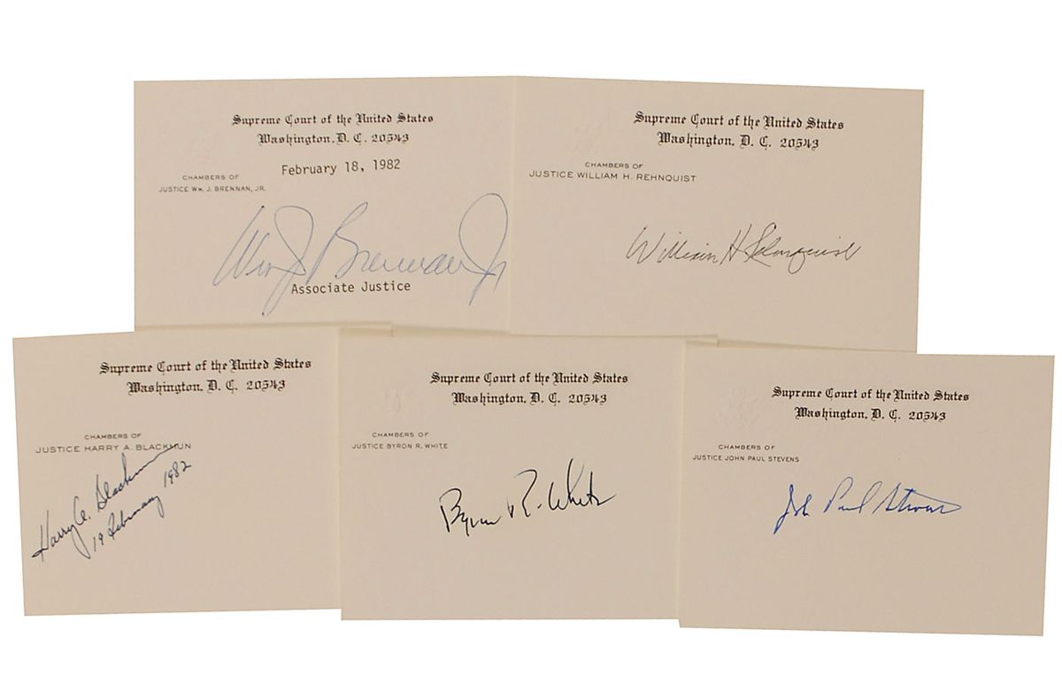 Five individual Supreme Court chamber cards, most 4.75 x 3.5, each signed in ink by a different justice. Signers are: William H. Rehnquist, Harry A. Blackmun (adding “19 February 1982”), William J. Brennan, John Paul Stevens, and Byron R. White. In overall fine condition.