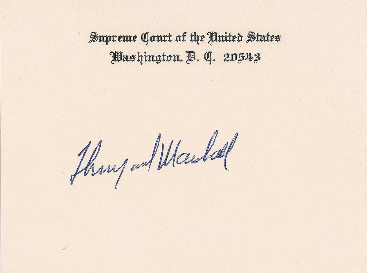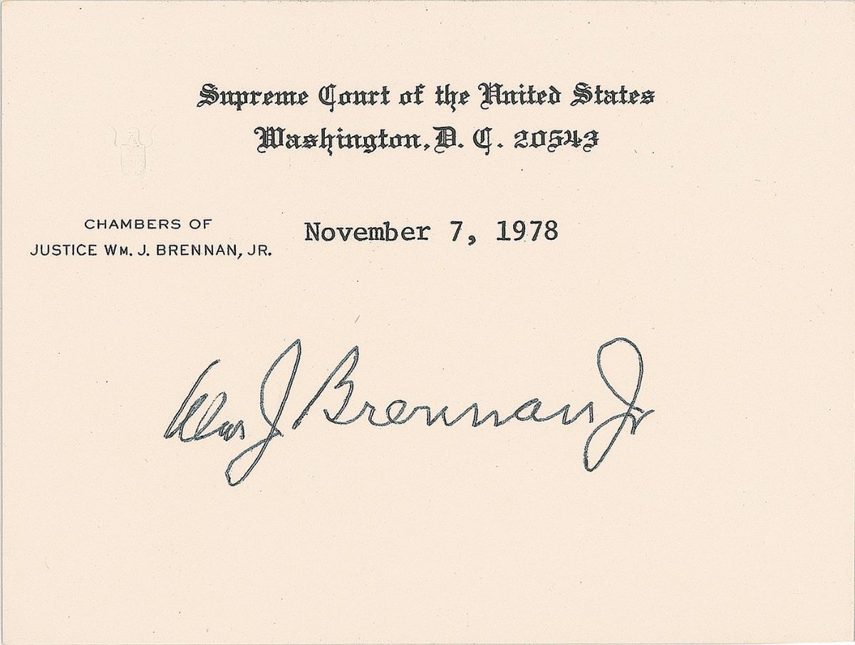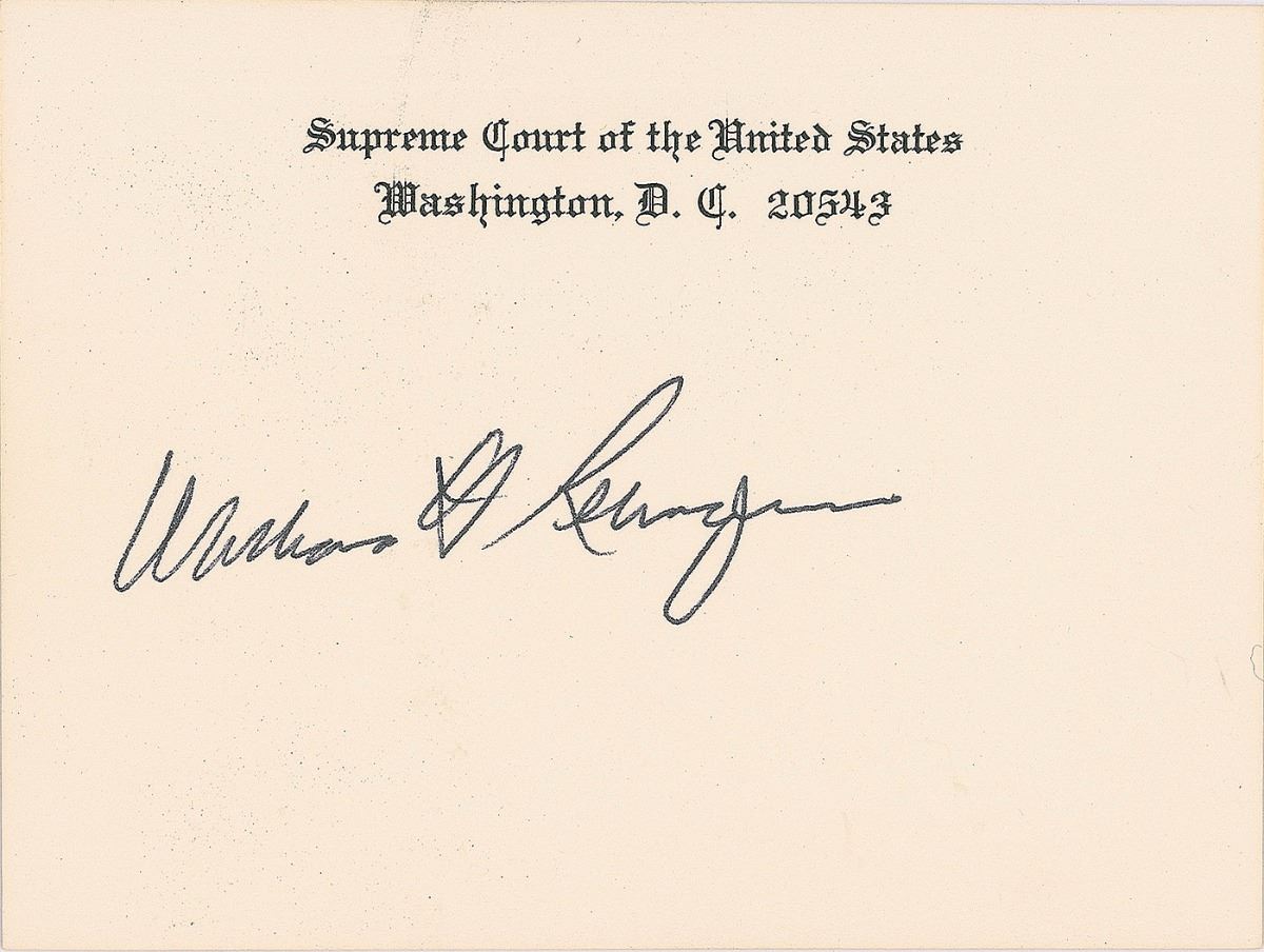 Appealing set of seven Supreme Court of the United States cards, each 4.5 x 3.25, individually signed in ink or ballpoint by an associate justice, including: Thurgood Marshall, William Brennan, Jr., William Rehnquist, John Paul Stevens, Byron White, Potter Stewart, and Harry A. Blackmun, who adds the date, “October 25, 1978.” The Stewart cards bears a typed inscription, dated November 1978. In overall fine condition.