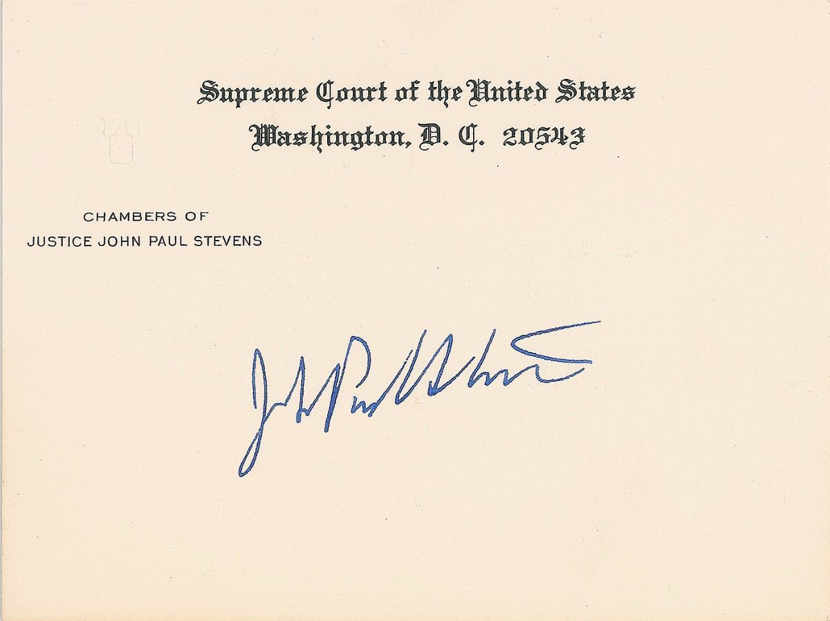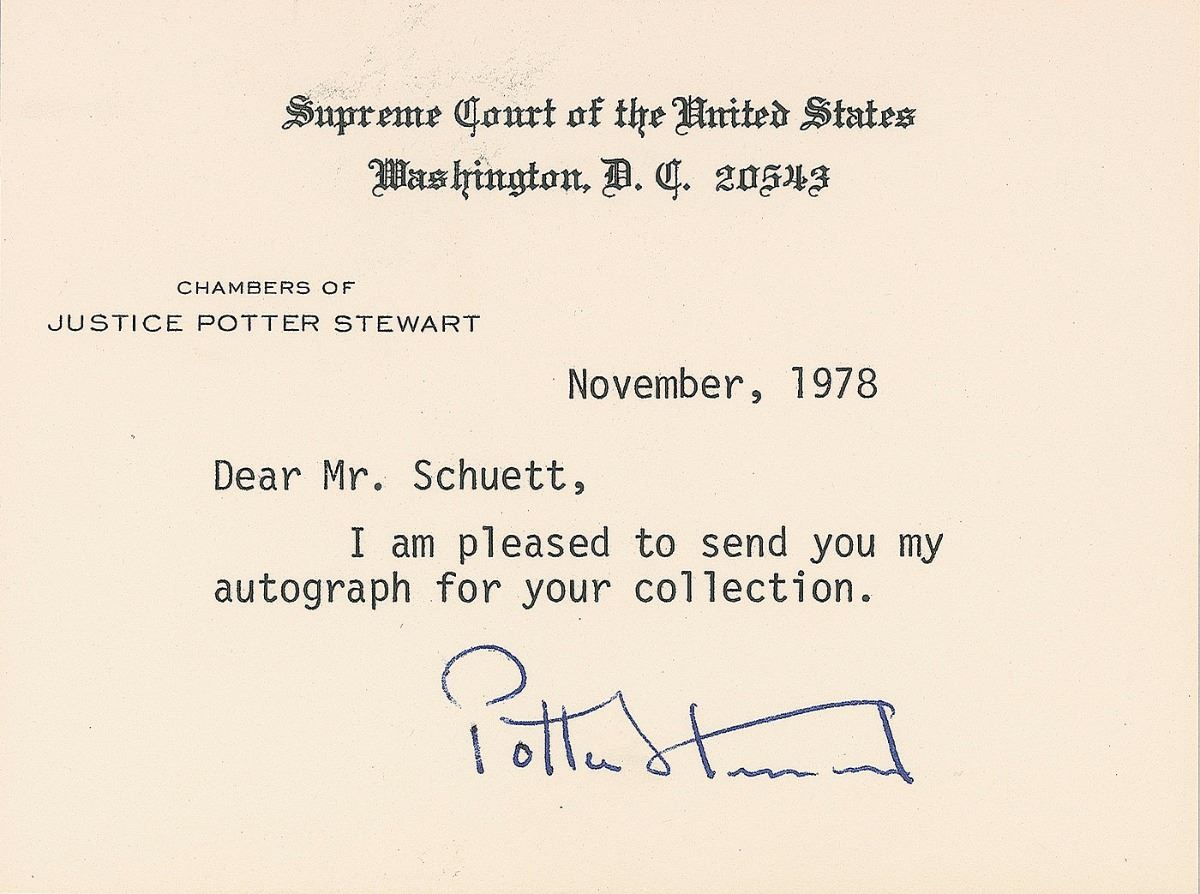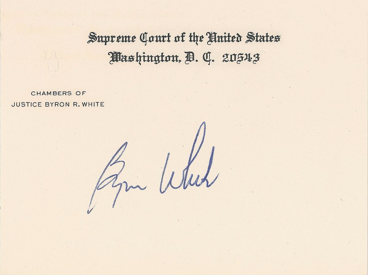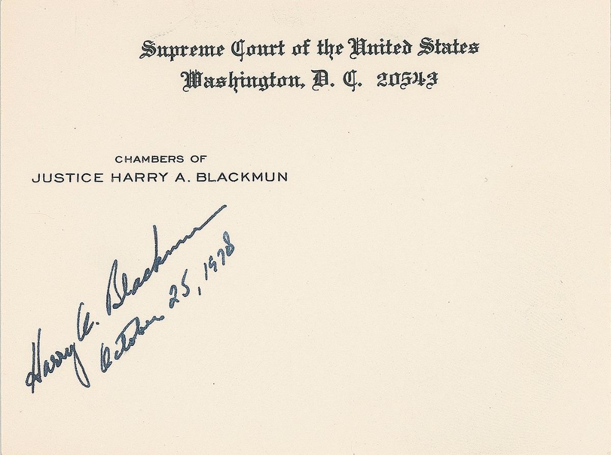 Appealing set of seven Supreme Court of the United States cards, each 4.5 x 3.25, individually signed in ink or ballpoint by an associate justice, including: Thurgood Marshall, William Brennan, Jr., William Rehnquist, John Paul Stevens, Byron White, Potter Stewart, and Harry A. Blackmun, who adds the date, “October 25, 1978.” The Stewart cards bears a typed inscription, dated November 1978. In overall fine condition.