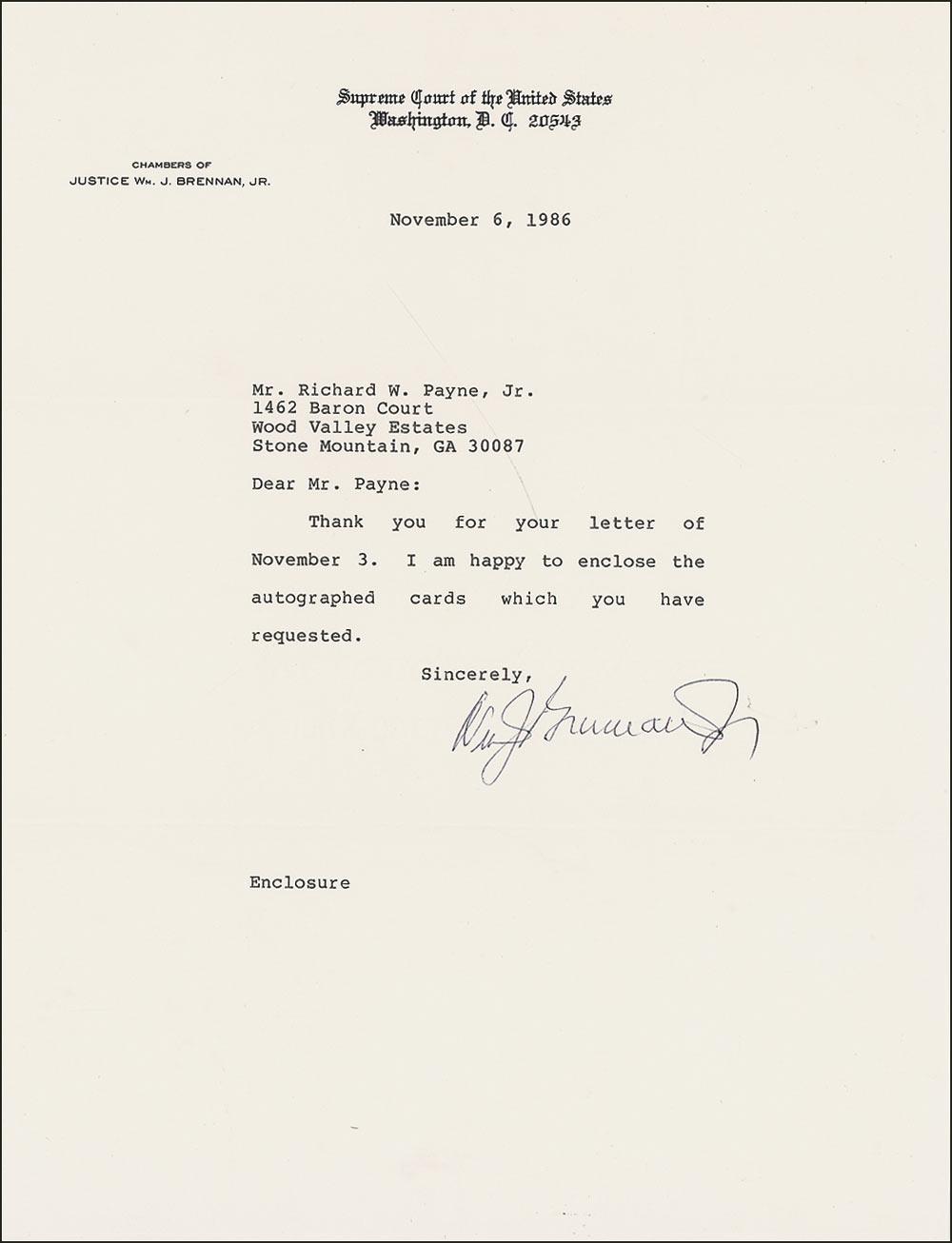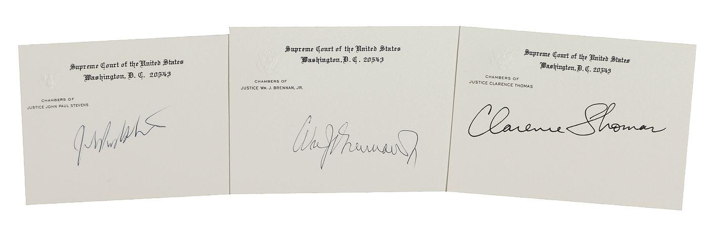 Ink signatures of William J. Brennan, John Paul Stevens, and Clarence Thomas on individual off-white Supreme Court cards; and a brief TLS, signed “Wm. J. Brennan, Jr.,” dated November 6, 1986, complying with an autograph request. In fine condition. RRAuction COA.
