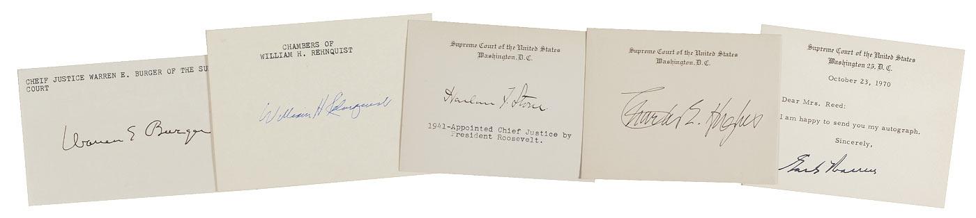 Five items: three signed Supreme Court cards, two 4.25 x 3.25 and one 4.5 x 3.5, signed in ink by Earl Warren, Harlan F. Stone, Charles E. Hughes, respectively; and two ink signatures of Warren E. Burger and William H. Rehnquist on individual cards. In overall fine condition, with scattered toning. All five of these signatories have at one time served as Chief Justice.