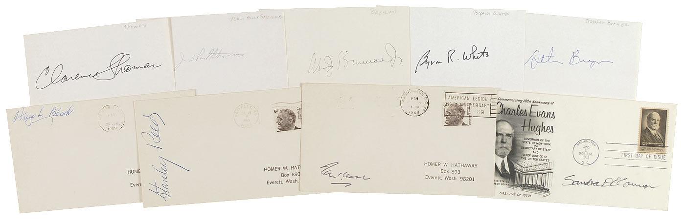 Nine items: five ink signatures on individual 5 x 3 cards. Signers are Stephen Breyer, Byron White, William J. Brennan, John Paul Stevens, and Clarence Thomas; FDC bearing a cachet honoring Charles Evans Hughes, signed by Sandra Day O’Connor; and three envelopes, each postmarked in 1969 and individually signed by Hugo L. Black, Stanley Reed, and Tom Clark. In overall fine condition, with a collector’s notation lightly written in pencil on the five cards.