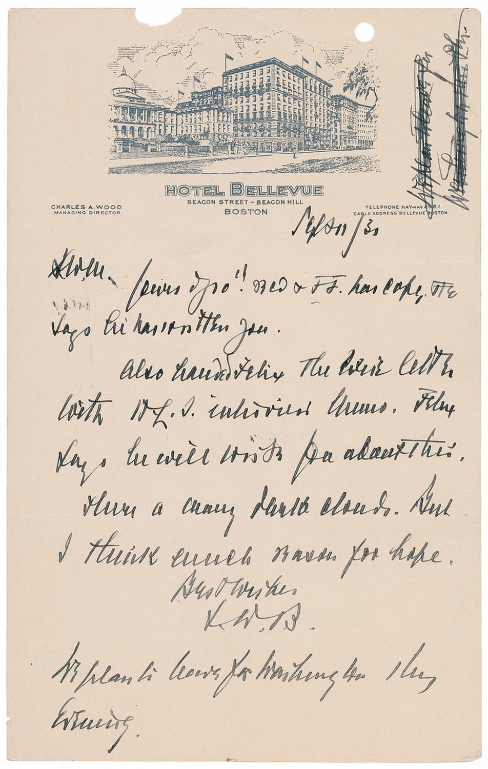 ALS signed “L.D.B.,” one page, 6 x 9.5, Hotel Bellevue letterhead, September 11, 1930. Short letter in his difficult to decipher hand reads, in part: “Also handed Felix…the letter with H.L.S. interview…Felix says he will write you about this. There are many dark clouds. But I think much reason for hope.” In his short postscript, Brandeis writes, “We plan to leave for Washington this evening.” Punch holes to top edge, a few light creases, crossed out notation to top right, and a mild shade of toning, otherwise fine condition.