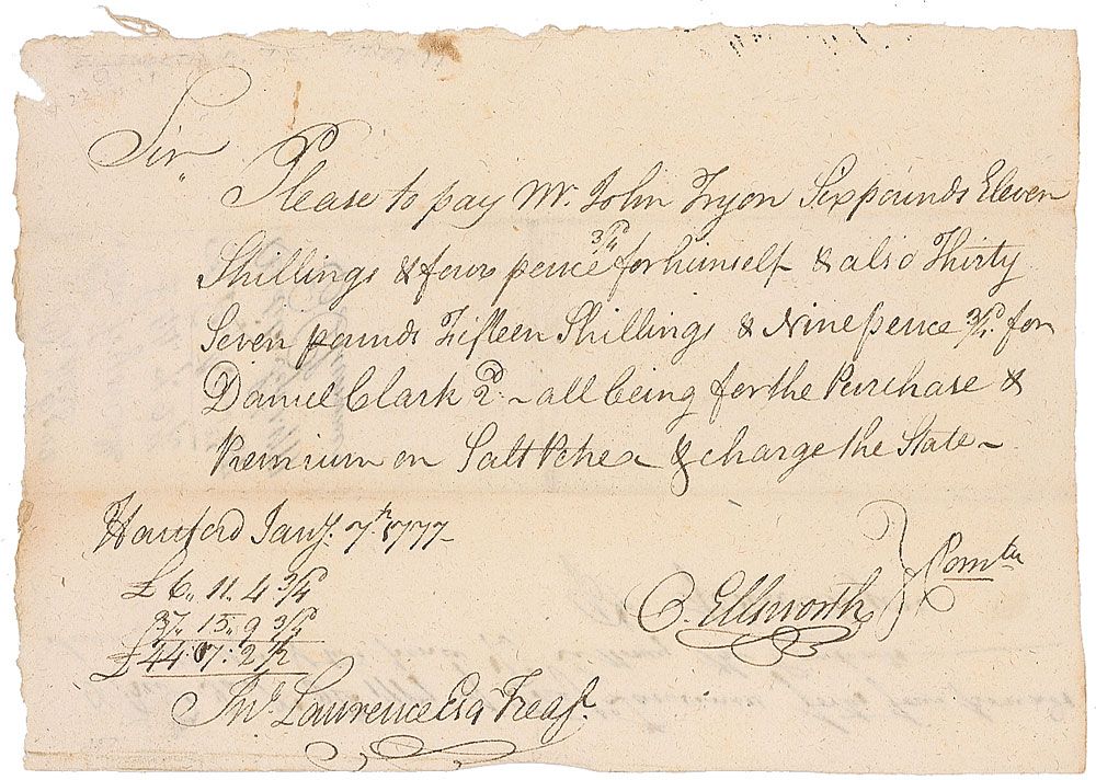 Third Chief Justice of the United States (1745–1807) and delegate to the Constitutional Congress who later submitted the amendments which became the Bill of Rights. Revolutionary War-dated manuscript DS, signed “O. Ellsworth,” one page, 8.25 x 6, January 7, 1777. Pay order reads, in part: “Please to pay Mr. John Tryon…and also…Daniel Clark, 2nd, all being for the purchase and premium on saltpetre and charge the state.” In fine condition, with two horizontal folds, trivial paper loss to left edge, and a couple spots of mild toning.