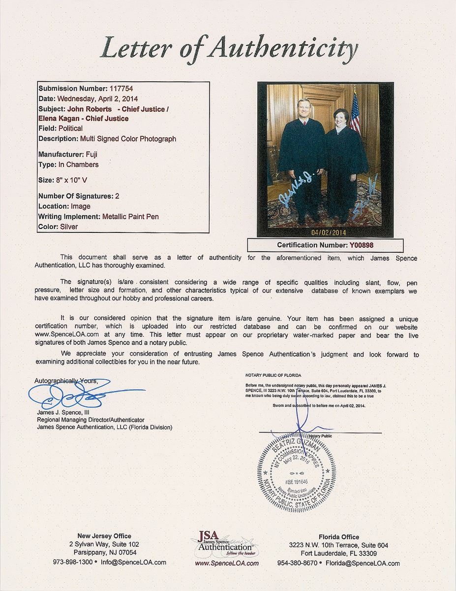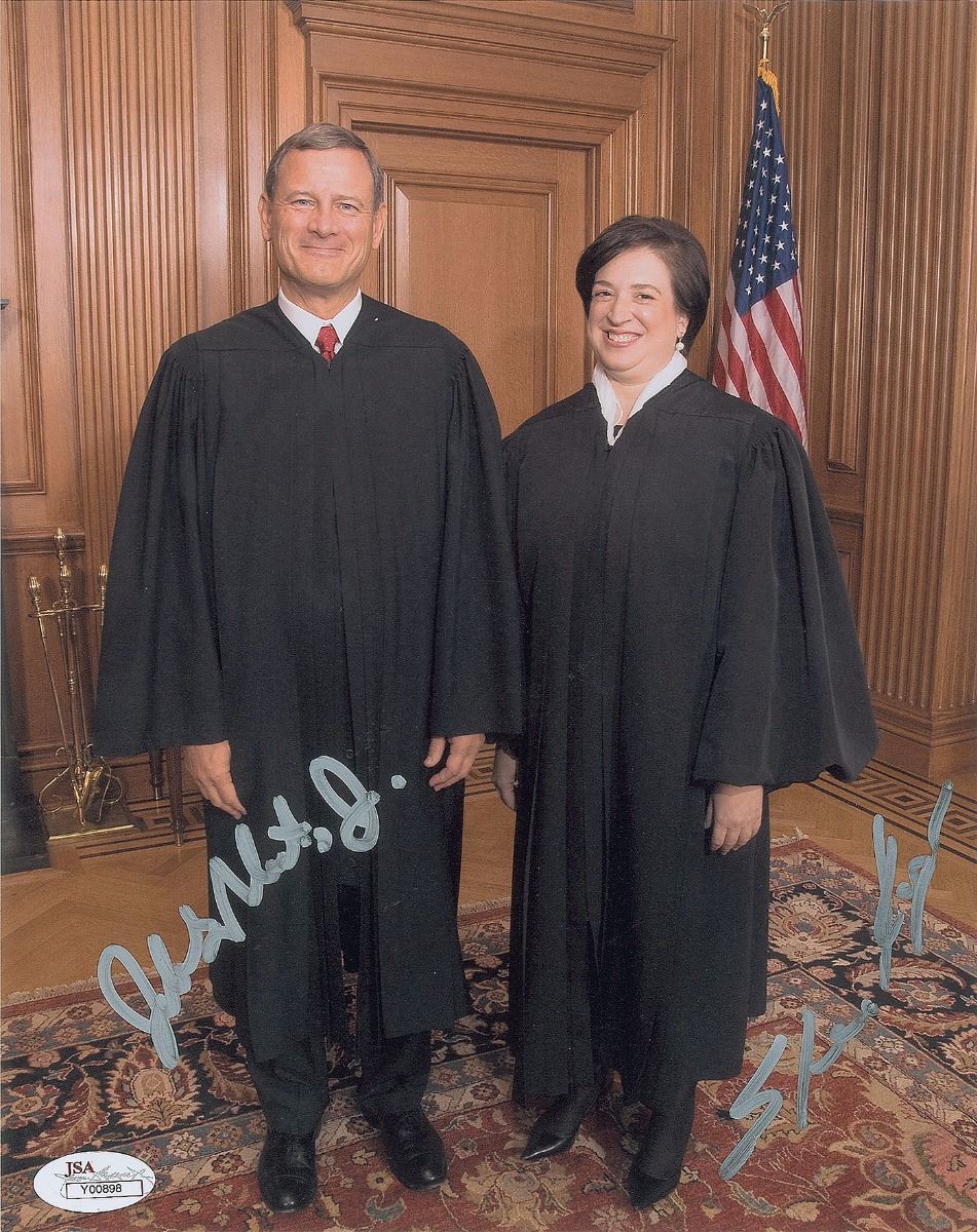 Color satin-finish 8 x 10 photo of the Supreme Court justices in their robes, signed in silver ink by John Roberts and Elena Kagan. In fine condition, with a JSA label affixed to the lower corner. Accompanied by a full letter of authenticity from JSA.