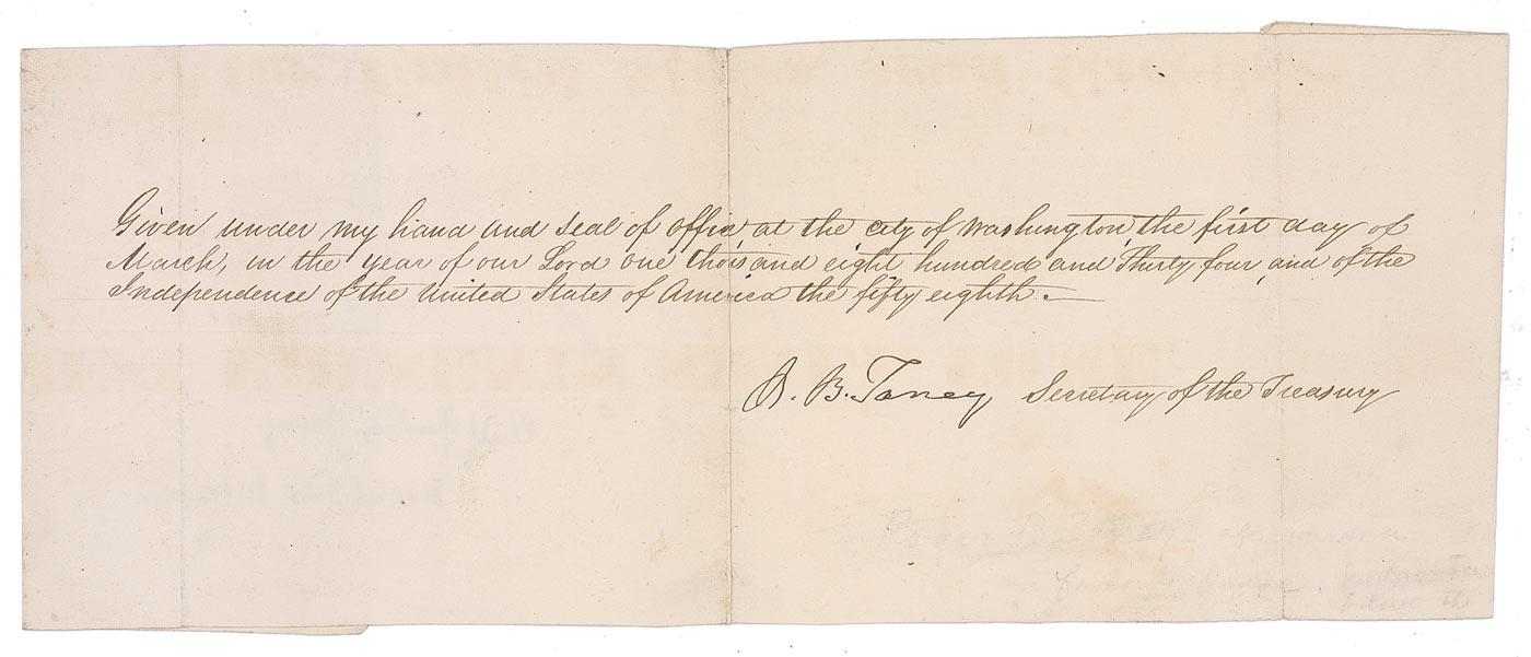 Self-contained partial DS bearing the ink signature,“R. B. Taney,” 15.75 x 4.5, March 1, 1834. The bottom portion of a larger document, with three lines of text. In fine condition, with vertical folds (heavy central vertical fold), scattered creasing, and mounting residue to the far left and right sides.