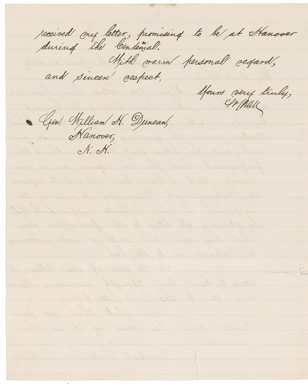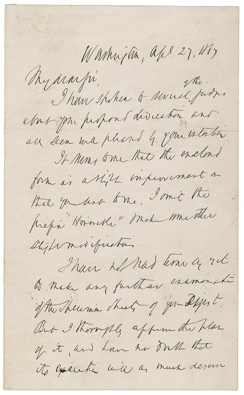 ALS signed “S. P. Chase,” one page both sides, 5 x 8, April 27, 1867. Chase writes noted legal author Benjamin V. Abbott in response to a letter and after reviewing a document. “I have spoken to several of the judges about your proposal…and all seem well pleased.” Intersecting folds, few small holes, and old tape repairs, otherwise fine condition. Interesting content from the chief justice.
