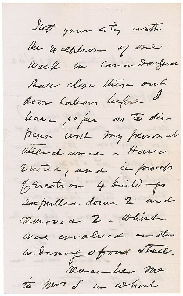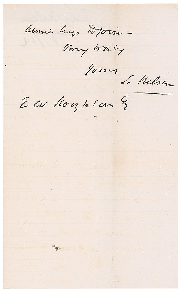 American jurist (1792–1873) who served on the Supreme Court from 1845 to 1872. ALS signed “S. Nelson,” three pages on two adjoining sheets, 4.75 x 8, Cooperstown, July 13, 1862. Letter to Edwin Wallace Stoughton. In part: “I have been in the burnt district since I left your city with the exception of one week in Canandaigua. Shall close these out door labors before I leave…Have erected, and in the process of erection 4 buildings, pulled down 2 and removed 2, which involved in the widening of our street.” Intersecting folds, a slight brush to the main text, and mild mirroring to ink, otherwise fine condition. Cooperstown’s business district was devastated by a fire that began on April 10, 1862, and lasted for three days.