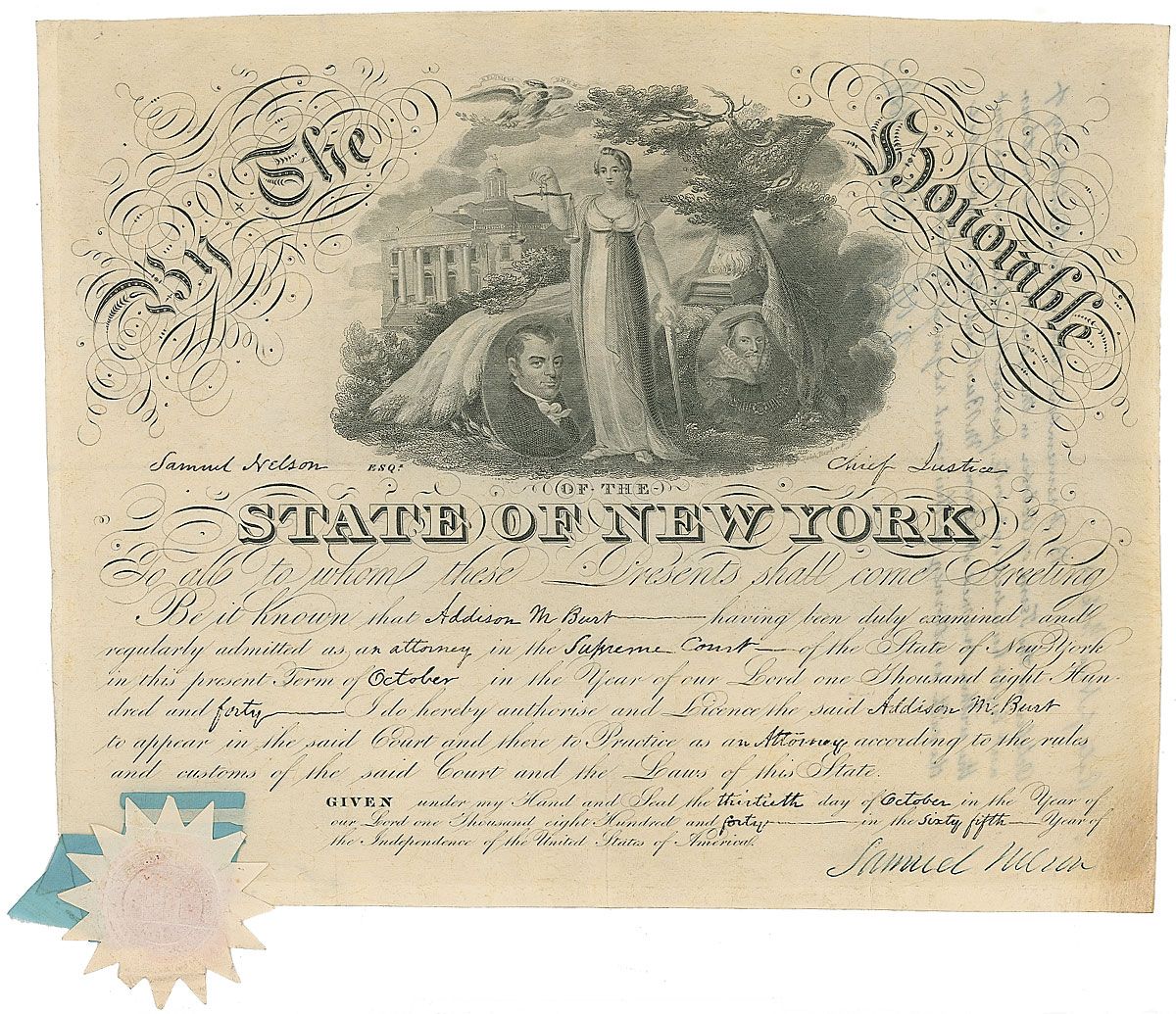 Supreme Court justice who served from 1845 to 1872 (1792–1873). Attractive vellum partly-printed DS, one page, 13 x 10.5, New York, October 13, 1840. Nelson confirms that Addison M. Burt is “admitted as an attorney in the Supreme Court of the State of New York.” Signed in the lower right by Nelson. Embossed paper seal and blue ribbon affixed to the left side remain crisp and fully intact. In fine condition.