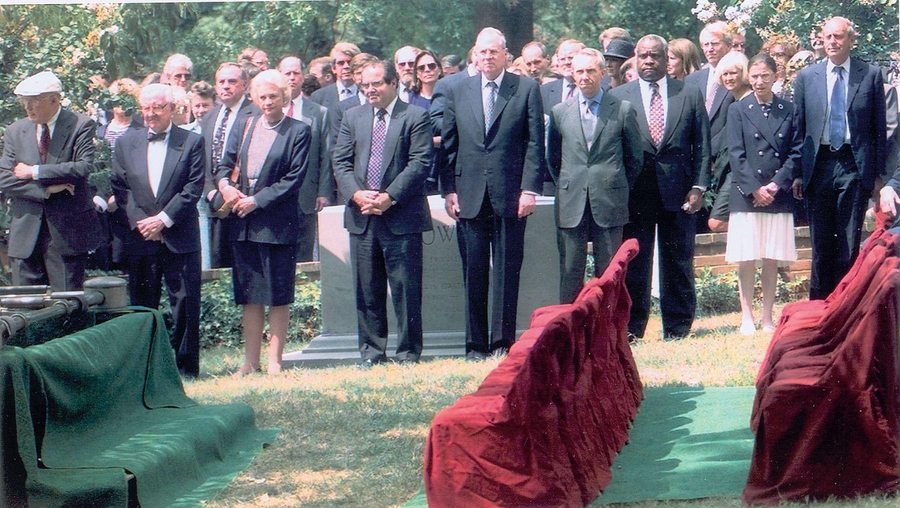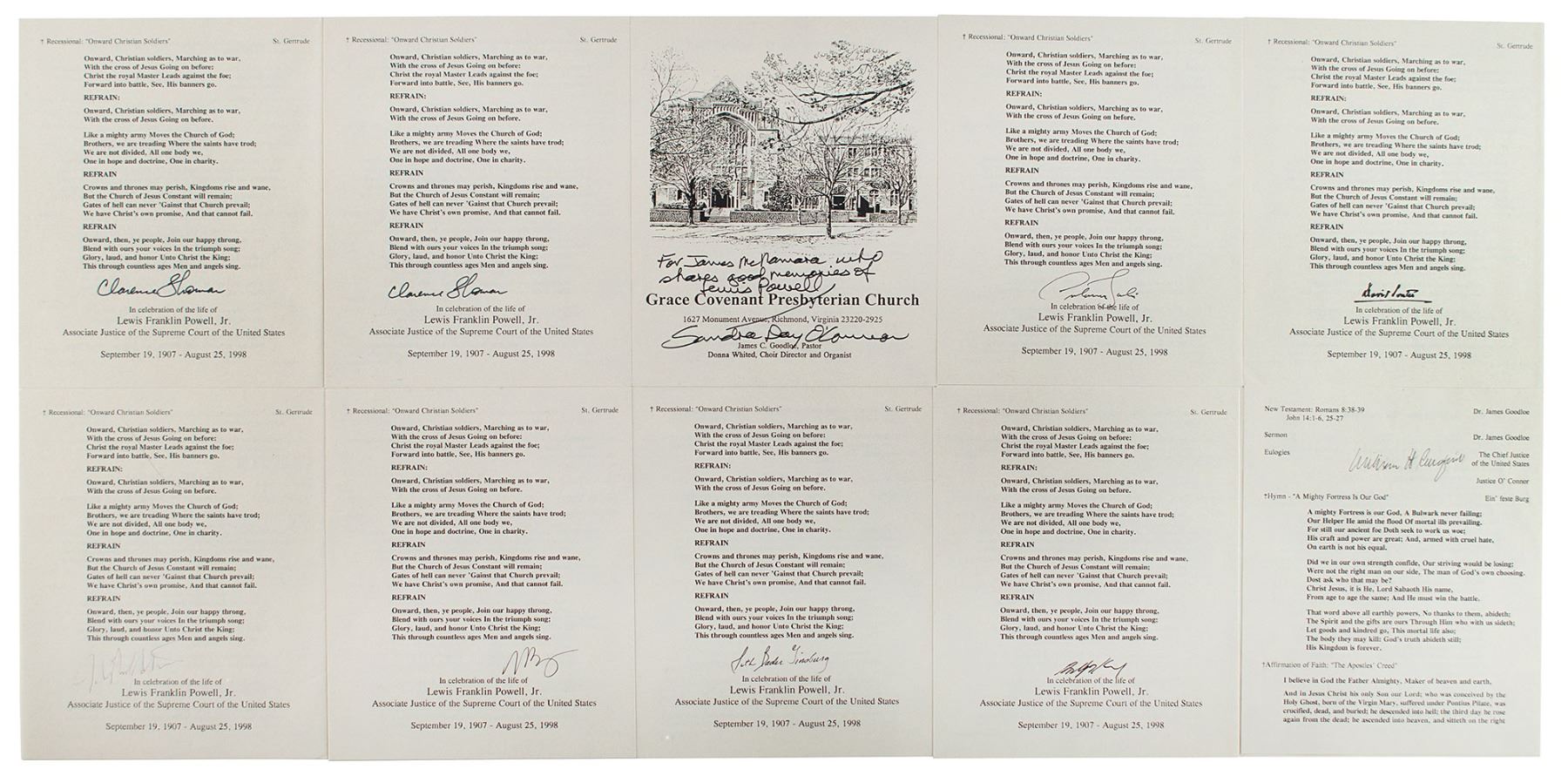 Collection of 10 funeral programs from the Grace Covenant Presbyterian Church of Richmond, Virginia, in celebration of the life of Supreme Court Justice Lewis F. Powell Jr., who passed away on August 25, 1998. Each program, five pages, 7 x 8.5, is signed either on the front or back cover, or on the inside, in ink or felt tip by a fellow Justice of the Supreme Court, including: Stephen Breyer, Ruth Bader Ginsburg, Anthony Kennedy, Sandra Day O'Connor, William Rehnquist, Antonin Scalia, David Souter, John Paul Stevens, and Clarence Thomas (2). In overall very fine condition. Accompanied by a photo of the above mentioned justices standing together at the funeral.