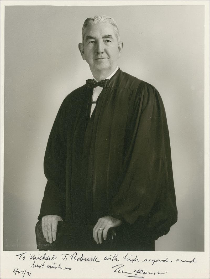 Matte-finish 7.25 x 10 Hessler portrait of Clark in his judicial robe, signed and inscribed in the lower border in black ballpoint “To Michael J. Robuck, with high regards and best wishes, Tom Clark, 5/27/71.” In fine condition, with trivial corner tip crease and a fingerprint over signature.