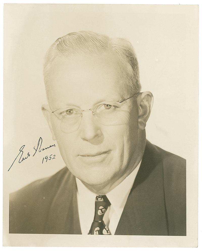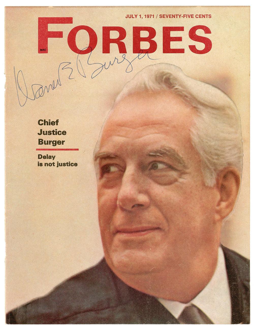 Two items: matte-finish 8 x 10 portrait of Earl Warren signed in fountain pen, “Earl Warren 1952”; and a Forbes magazine cover from July 1, 1971, signed in blue ballpoint, “Warren E. Burger.” In overall fine condition.