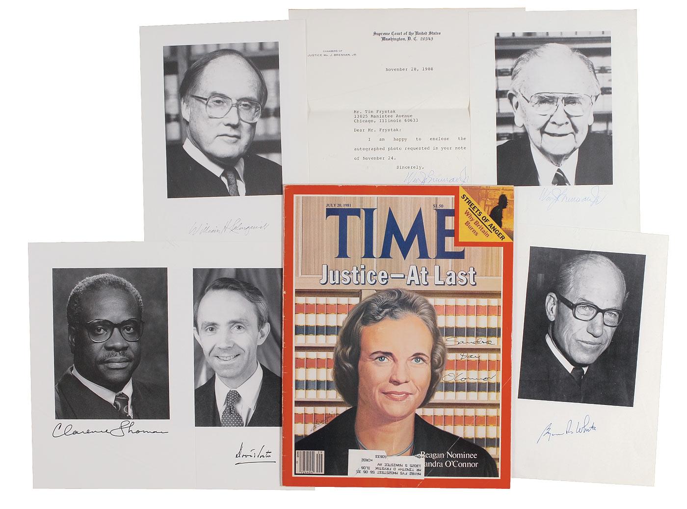 Seven items: five 6 x 9 paperstock official portraits individually signed in ink by William Rehnquist, William J. Brennan, David Souter, Clarence Thomas, and Byron White; a July 21, 1981, TIME magazine signed in black felt tip on the front cover by Sandra Day O’Connor; and a TLS from Brennan acknowledging an autograph request. In overall fine condition, with a small piece of the upper right corner missing from the White photo and a mailing label affixed to the magazine. Each is accompanied by its original mailing envelope.