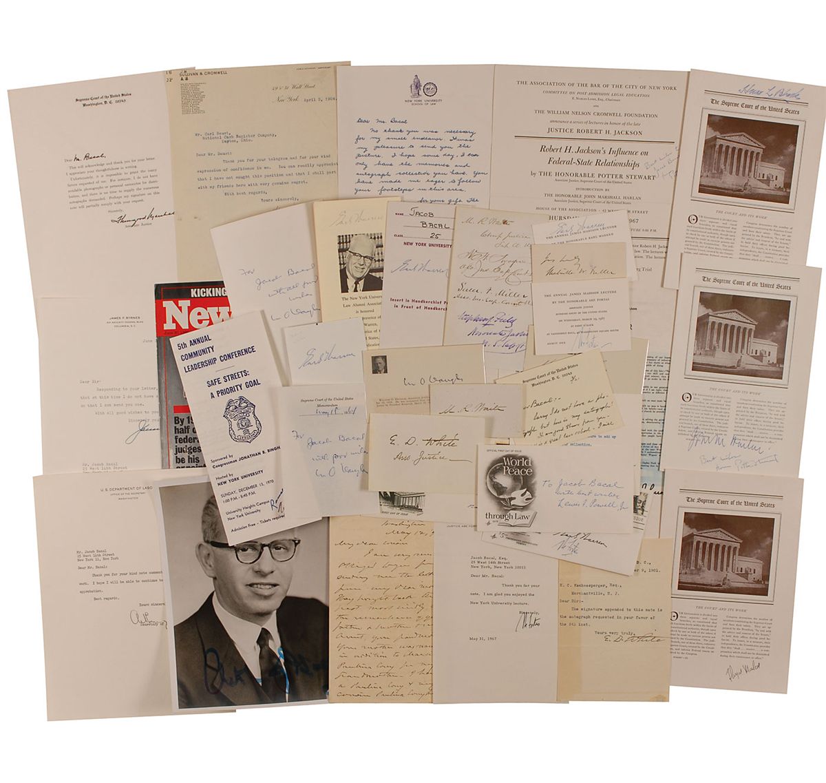 Thirty-three items, consisting of photos, letters, cards, and souvenir typescripts, each signed by a Supreme Court justice, with some signed by multiple justices. Signers are: Thurgood Marshall (2), William Rehnquist, William O. Douglas (3), Potter Stewart (2), Earl Warren (5), Melville Fuller (2), James F. Byrnes, John M. Harlan, Harlan F. Stone, Hugo L. Black (2), Tom C. Clark (3), Abe Fortas (4), Fred M. Vinson, Lewis F. Powell, Jr., Arthur J. Goldberg (2), Morrison Waite (2), Noah Haynes Swayne, Samuel Freeman Miller, Stephen J. Field, Edward Douglass White (2). In overall fine condition.