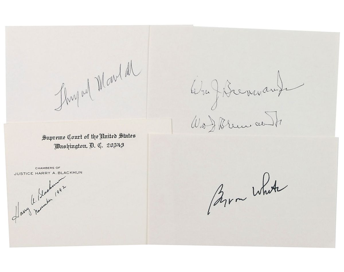 Four ink signatures of Supreme Court justices on individual off-white cards, each approximately 5 x 3. Signers are: Thurgood Marshall, Byron White, William J. Brennan, Jr. (signed twice), and Harry A. Blackmun. In overall fine condition. Accompanied by the original mailing envelope for the Marshall signature. An important grouping with Blackmun being the author of the landmark ‘Roe v. Wade,’ and Marshall being the first black Supreme Court justice.