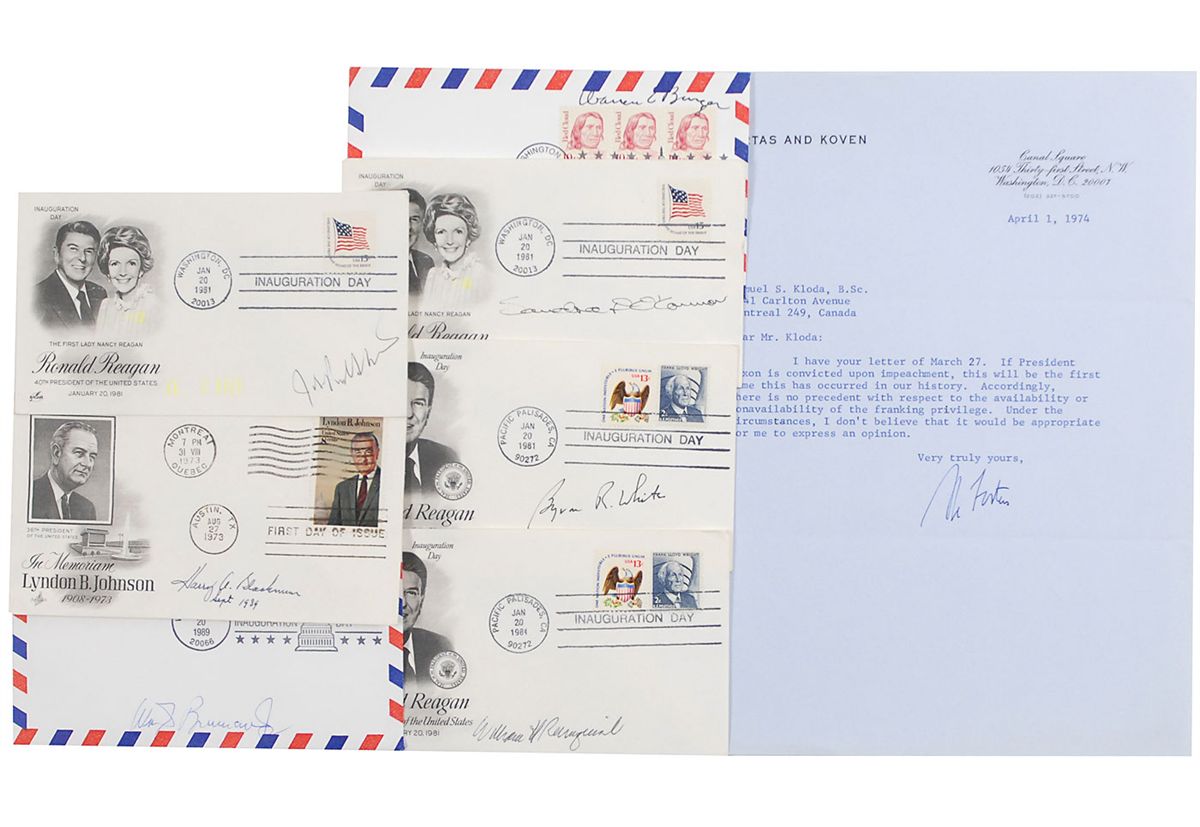 Eight items consisting of seven commemorative covers and one TLS. Covers are signed by Harry A. Blackmun; Warren Burger; William H. Rehnquist; Sandra Day O’Connor; William J. Brennan; Byron White; and John Paul Stevens; and a 1974 one-page TLS signed by Abe Fortas concerning the franking privileges of Richard Nixon should he be impeached. In fine condition.
