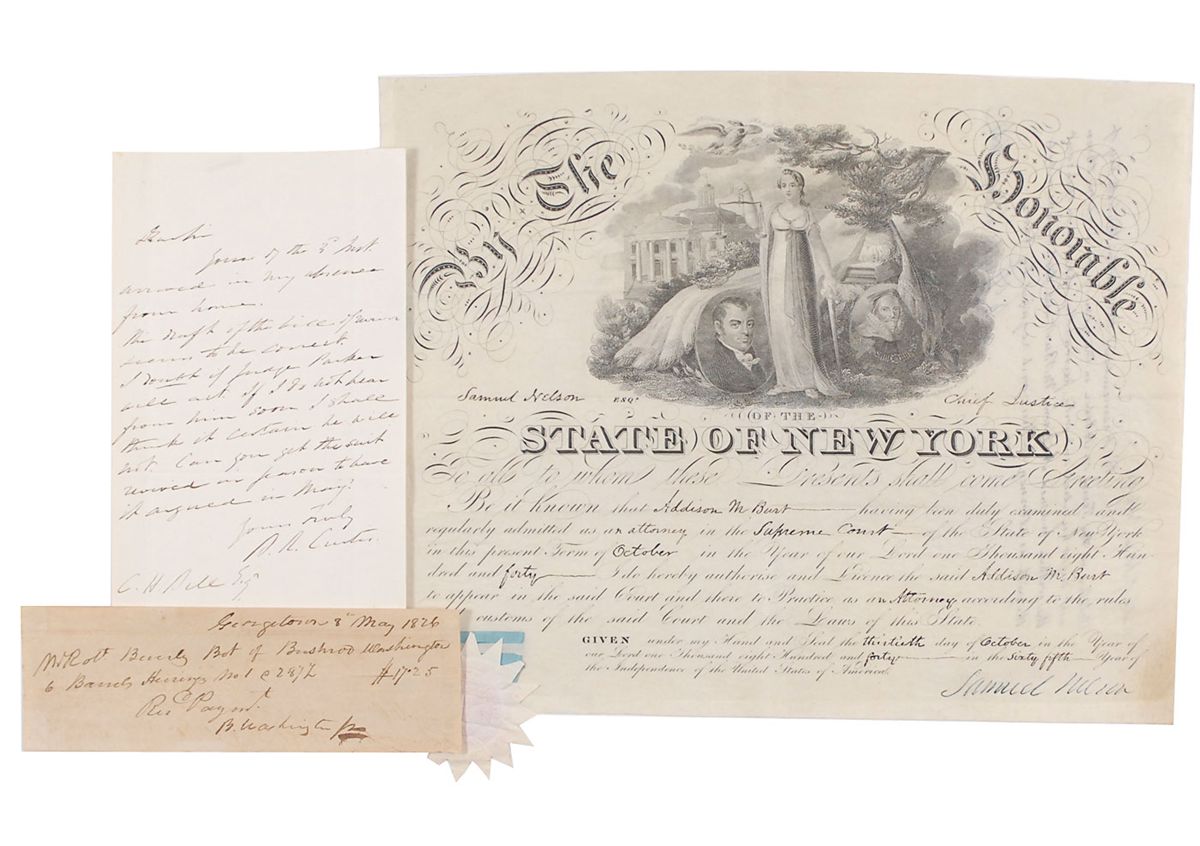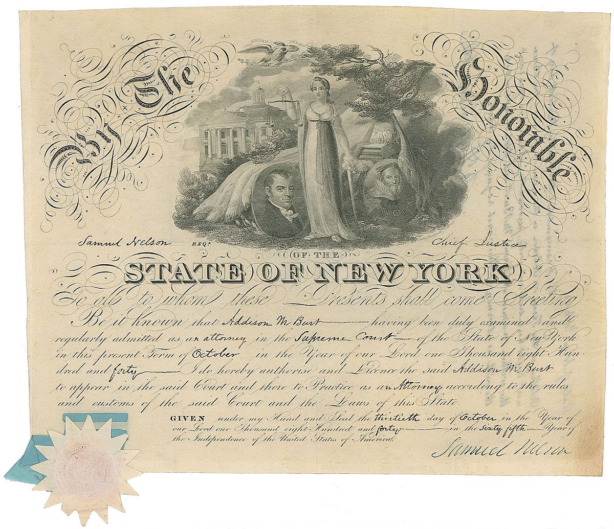 Samuel Nelson: Supreme Court justice who served from 1845 to 1872 (1792–1873). Attractive vellum partly-printed DS, one page, 13 x 10.5, New York, October 13, 1840. Nelson confirms that Addison M. Burt is “admitted as an attorney in the Supreme Court of the State of New York.” Signed in the lower right by Nelson. Embossed paper seal and blue ribbon affixed to the left side remain crisp and fully intact. In fine condition.