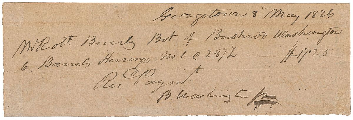 Bushrod Washington: Nephew of George Washington appointed to the Supreme Court by John Adams, where he served from 1798 until his death (1762–1829). Manuscript DS, signed “B. Washington,” one page, 7.5 x 2.5, Georgetown, May 8, 1826. Washington confirms receipt of a $17.25 payment for “6 Barrels Herrings.” In fine condition.