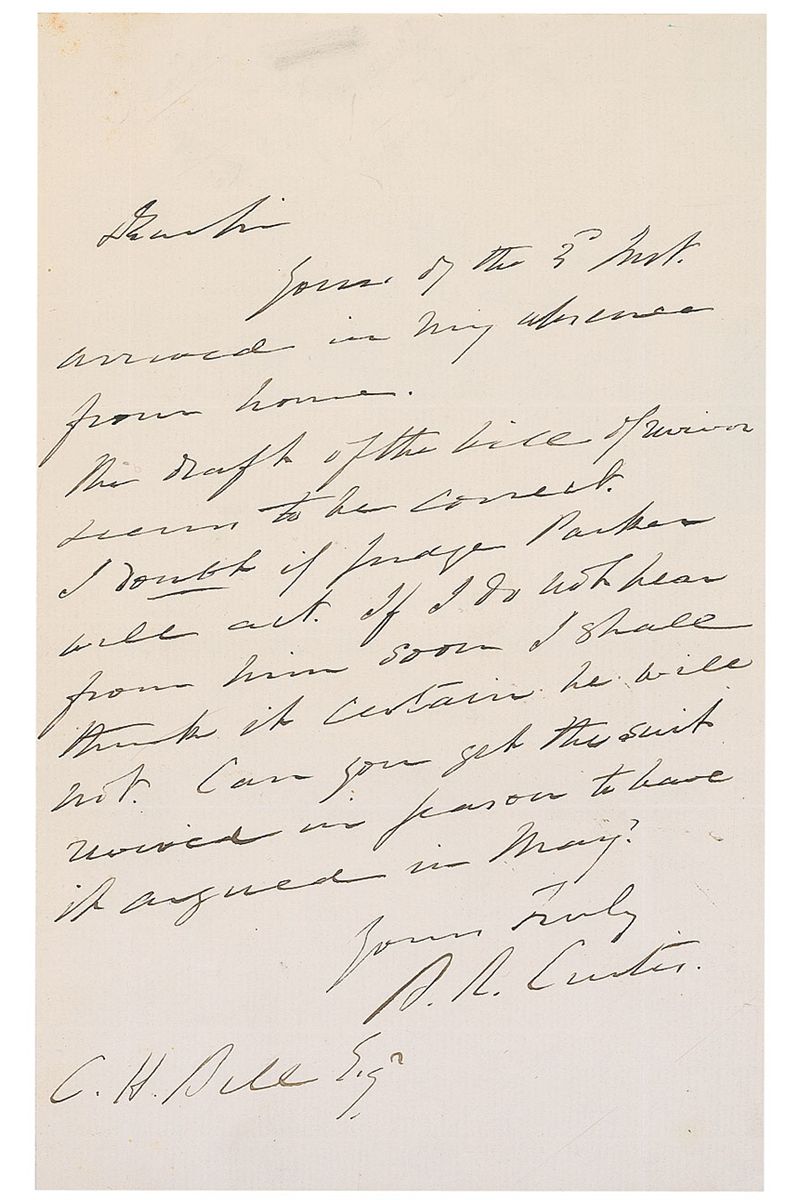 Benjamin Robbins Curtis: Supreme Court justice from 1851 to 1857, especially notable as one of the two dissents in the Dred Scott decision; as an attorney, he served as chief counsel for Andrew Johnson during his first impeachment trial (1809–1874). ALS signed “B. R. Curtis,” one page, 5 x 8, no date. Letter to C. H. Bull, Esq. In part: “The draft of the bill…seems to be correct. I doubt if Judge Parker will act. If I do not hear from him soon I shall think it certain he will not.” In fine condition.